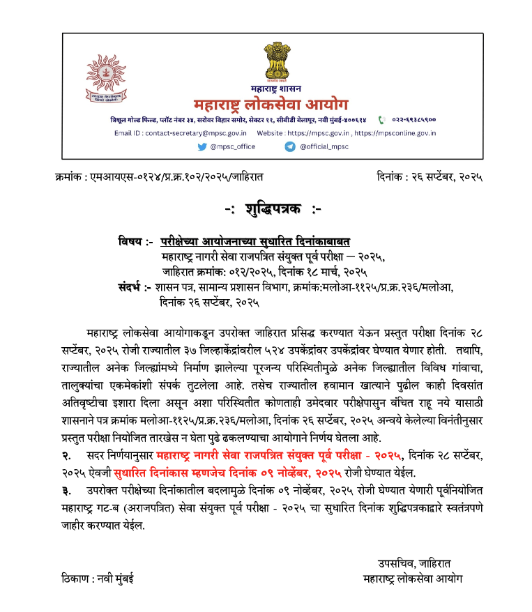 उपरोक्त परीक्षेच्या दिनांकातील बदलामुळे दिनांक 9 नोव्हेंबर 2025 रोजी घेण्यात येणारी पूर्वनियोजित महाराष्ट्र गट -ब (अराजपत्रित) सेवा संयुक्त पूर्व परीक्षा – 2025 चा सुधारित दिनांत शुद्धिपत्रकाद्वारे स्वतंत्रपणे जाहीर करण्यात येईल.