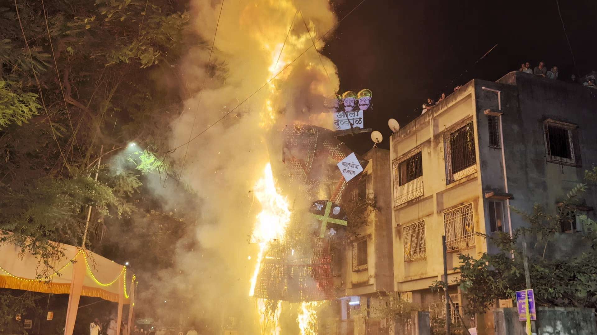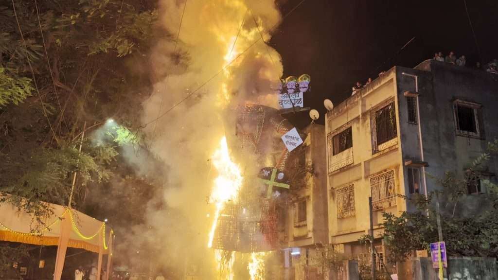पुणे – पुणे लोकमान्य फेस्टिवलच्या वतीने दसऱ्याच्या निमित्ताने लोकमान्य नगर जॉगिंग पार्क जवळ येथे यंदा 30 फुटी रावणाची प्रतिकृती बनवण्यात आली होती. ओला दुष्काळ, अत्याचारी, वाढती गुन्हेगारी, बेरोजगारी, दहशतवाद अशा रूपात्मक रावणाच्या प्रतिकृतीचे दहन करण्यात आले.