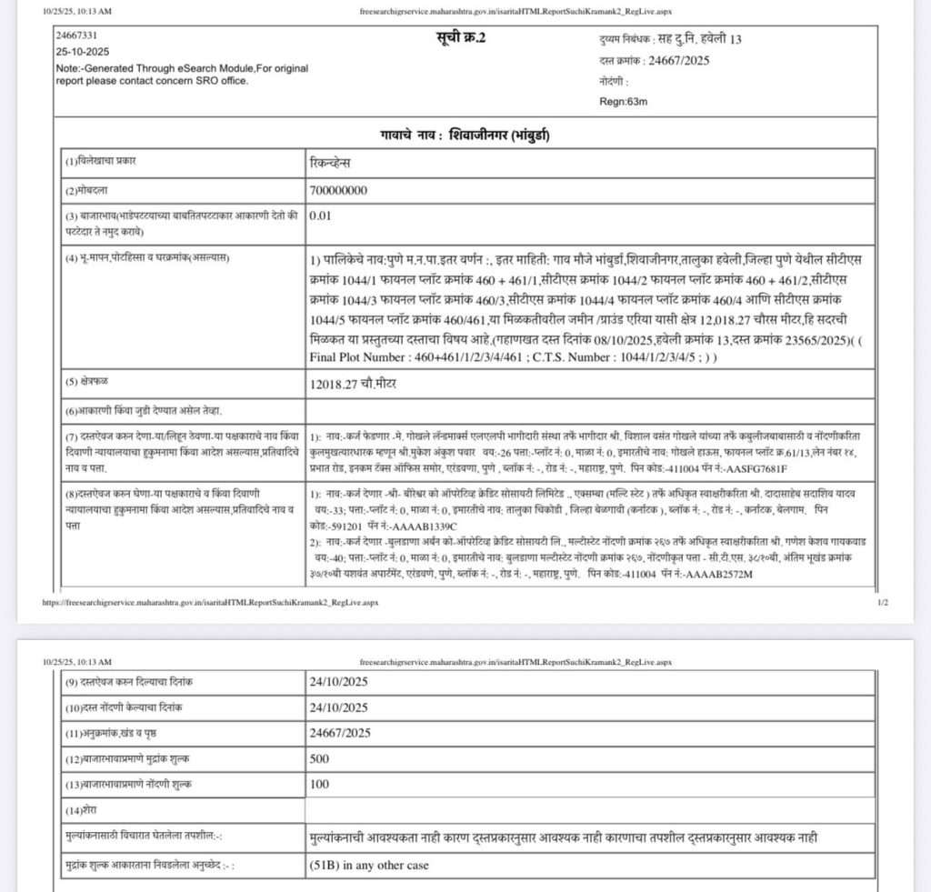 विजय कुंभार यांनी म्हटलं आहे की, पुण्याच्या मॉडेल कॉलनीमधील जमिनीच्या व्यवहारांमध्ये आता अनेक नवीन नवीन बनवाबनवीचे प्रयोग दिस येऊ लागले आहेत. या जमिनीला दोन पतसंस्थांनी कर्ज दिलं. त्यामध्ये बुलढाणा व कर्नाटकातील भिडेश्वर पतसंस्था होती. 70 कोटी कर्ज दिलं. त्यामध्ये बऱ्याच गडबडी झाल्या. त्याचे गहाणखत सुद्धा झालं. गहाणखत झाल्यानंतर काही दिवसांनी त्या बँकांनी सांगितलं होतं की आमचा या प्रॉपर्टीवरचा बोजा कमी करा, म्हणजे आमचा आता या प्रॉपर्टीवर हक्क नाही. त्यांच्या त्या पत्रावरही हस्तक्षेप घेण्यात आले. त्यानंतर काल या पतसंस्थांनी रिकन्व्हेन्स डीड म्हणजे जी प्रॉपर्टी घेतली होती त्या प्रॉपर्टीवर आता आपला हक्क नाही, ती प्रॉपर्टी पुन्हा मूळ मालकाकडे आपण सोपवत आहोत अशा अर्थाचा एक दस्त तयार करून घेतला.