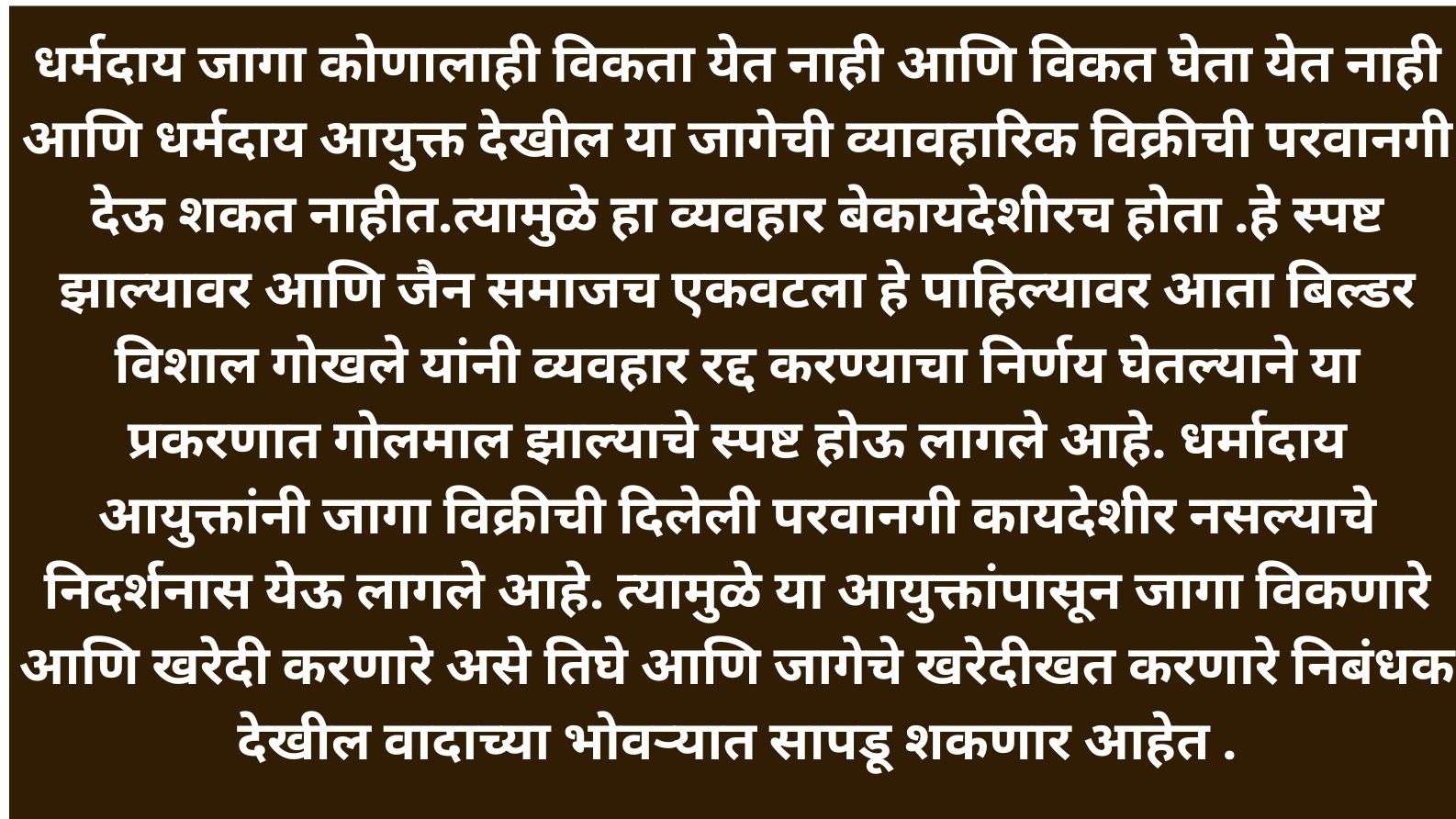 पुणे-येथील जैन बोर्डिंग ट्रस्टच्या जागेच्या विक्री व्यवहार बिल्डर विशाल गोखले यांनी हा व्यवहार पूर्णपणे रद्द करण्याचा निर्णय घेतला आहे. त्यांनी याबाबतचा निर्णय ई-मेलद्वारे जैन ट्रस्टचे चेअरमन आणि ट्रस्टींना कळवला असून, धर्मदाय आयुक्तालयालाही याबाबत पत्र पाठवलं आहे. ई-मेलमधून त्यांनी स्पष्ट केलं आहे की, नैतिकतेच्या आणि धर्मीय भावनांचा आदर राखत ते या व्यवहारातून माघार घेत आहेत. तसेच, आधी जमा केलेले 230 कोटी रुपये परत देण्याची मागणीही गोखले यांनी केली आहे. भाजपचे खासदार आणि केंद्रीय राज्यमंत्री मुरलीधर मोहोळ यांच्यावर या व्यवहारात अप्रत्यक्षरीत्या भूमिका बजावल्याचा आरोप करण्यात आला होता. शिवसेना शिंदे गटाचे नेते आणि माजी आमदार रवींद्र धंगेकर हे या प्रकरणात सर्वात आक्रमक भूमिकेत होते. त्यांनी मुरलीधर मोहोळ यांच्यावर भ्रष्टाचार आणि राजकीय दबावाचे आरोप करत संतप्त प्रतिक्रिया व्यक्त केली होती. मात्र मोहोळ यांनी सर्व आरोप फेटाळून लावले होते आणि हा व्यवहार पूर्णपणे कायदेशीर असल्याचं म्हटलं होतं.वास्तविक पाहता अशी धर्मदाय जागा कोणालाही विकत येत नाही आणि विकत घेता येत नाही आणि धर्मदाय आयुक्त देखील या जागेची व्यावहारिक विक्रीची परवानगी देऊ शकत नाहीत.त्यामुळे हा व्यवहार बेकायदेशीरच होता .हे स्पष्ट झाल्यावर आणि जैन समाजच एकवटला हे पाहिल्यावर आता बिल्डर विशाल गोखले यांनी व्यवहार रद्द करण्याचा निर्णय घेतल्याने या प्रकरणात गोलमाल झाल्याचे स्पष्ट होऊ लागले आहे. धर्मादाय आयुक्तांनी जागा विक्रीची दिलेली परवानगी कायदेशीर नसल्याचे निदर्शनास येऊ लागले आहे. त्यामुळे या आयुक्तांपासून जागा विकणारे आणि खरेदी करणारे असे तिघे आणि जागेचे खरेदीखत करणारे निबंधक देखील वादाच्या भोवऱ्यात सापडू शकणार आहेत .