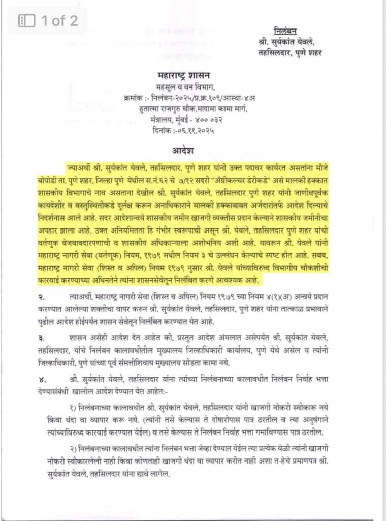 पुणे-पार्थ पवार जमीन घोटाळाप्रकरणी तहसीलदारांना निलंबित केलेले नाही तर डेअरीची शासकीय जागा खासगी व्यक्तीला दिल्याने निलंबित केले आहे असे येथे कॉंग्रेस प्रदेश अध्यक्ष हर्षवर्धन सपकाळ यांनी म्हटले आहे. याप्रकरणी त्यांनी निलंबनाच्या आदेशाची कॉपी देखील समाज माध्यमावर पोस्ट केली आहे.