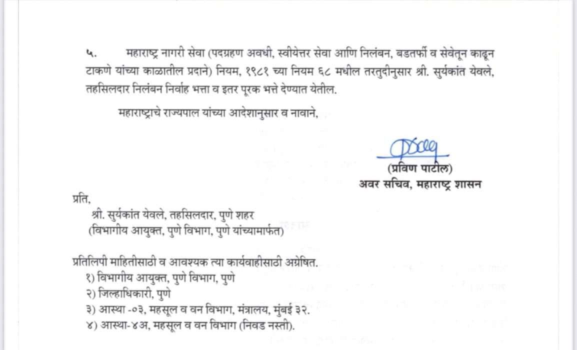 पुणे-पार्थ पवार जमीन घोटाळाप्रकरणी तहसीलदारांना निलंबित केलेले नाही तर डेअरीची शासकीय जागा खासगी व्यक्तीला दिल्याने निलंबित केले आहे असे येथे कॉंग्रेस प्रदेश अध्यक्ष हर्षवर्धन सपकाळ यांनी म्हटले आहे. याप्रकरणी त्यांनी निलंबनाच्या आदेशाची कॉपी देखील समाज माध्यमावर पोस्ट केली आहे.