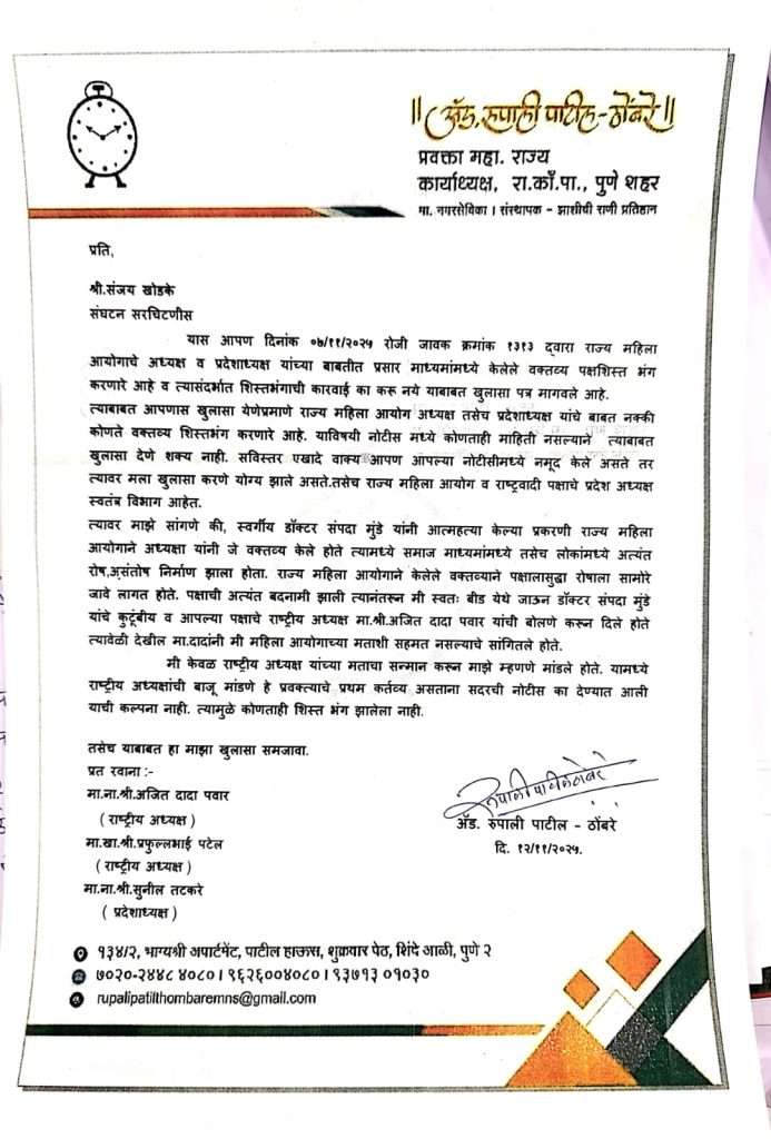 आपण दिनांक ०७/११/२०२५ रोजी जावक क्रमांक १३१३ द्वारा राज्य महिला आयोगाचे अध्यक्ष व प्रदेशाध्यक्ष यांच्या बाबतीत प्रसार माध्यमांमध्ये केलेले वक्तव्य पक्षशिस्त भंग करणारे आहे व त्यासंदर्भात शिस्तभंगाची कारवाई का करू नये याबाबत खुलासा पत्र मागवले आहे.