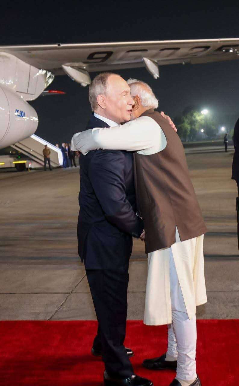 रशियाचे राष्ट्राध्यक्ष व्लादिमीर पुतिन भारतात आले आहेत. पंतप्रधान मोदींनी विमानतळावर त्यांचे स्वागत केले. दोन्ही नेत्यांनी एकमेकांना मिठी मारली. मोदी आणि पुतिन यांनी विमानतळावरून पंतप्रधानांच्या निवासस्थानापर्यंत एकाच गाडीने प्रवास केला.
