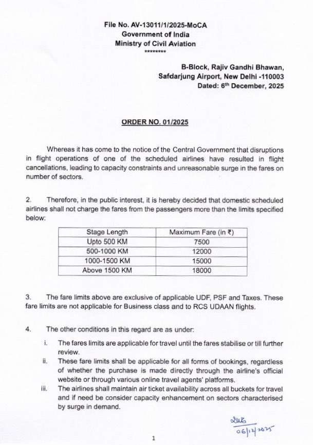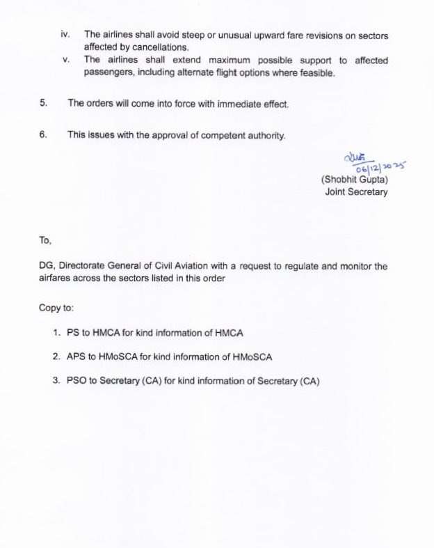 इंडिगो संकटादरम्यान काही विमान कंपन्यांकडून अतिरिक्त भाडे आकारले जात असल्याची गंभीर दखल नागरी उड्डाण मंत्रालयाने घेतली आहे. मंत्रालयाने सर्व विमान कंपन्यांना अधिकृत निर्देश जारी केले आहेत, ज्यामध्ये त्यांनी आता स्थापित केलेल्या भाडे मर्यादांचे काटेकोरपणे पालन करण्याचे आवाहन केले आहे. परिस्थिती स्थिर होईपर्यंत ही मर्यादा लागू राहतील.
