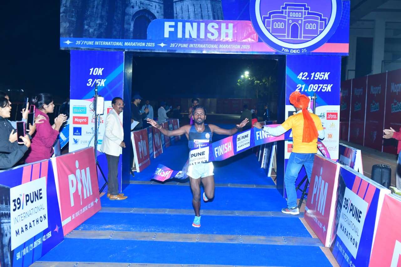 पुणे-39व्या पुणे अंतरराष्ट्रीय मॅरेथॉनमध्ये रविवार दि. 7 डिसेंबर रोजी सपन्न झालेल्या पूर्ण मेरेथॉन स्पर्धेत पुरुष गटात इथोपियाचा टेरेफे हैमानोत ( 2तास 20 मिनिटे 08 सेकंद) आणि पूर्ण मेरेथॉन महिला गटात भारताची साक्षी जडियाला ( 2 तास 39 मिनिटे 37 सेकंद ) यांनी प्रथम क्रमांक मिळवला. 42. 195 किमीच्या पूर्ण मेरेथॉन पुरुष गटात द्वितीय क्रमांक इथोपियच्या मिको देरेजे अलेनू (2तास 20 मिनिटे 09 सेकंद) आणि तृतीया क्रमांक भारताच्या त्रिथा पुन (2 तास 20 मिनटे 17 सेकंद) यांनी मिळवला.