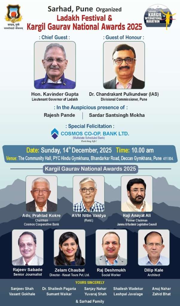 सीमावर्ती भागांमध्ये शांतता, एकात्मता आणि मानवीय राष्ट्रनिर्मितीसाठी कार्यरत असलेली पुणेस्थित सरहद संस्था रविवार, १४ डिसेंबर २०२५ रोजी सकाळी १०.०० वाजता, पीवायसी हिंदू जिमखाना, डेक्कन जिमखाना, पुणे ४ येथील कम्युनिटी हॉलमध्ये लडाख फेस्टिव्हल आणि कारगिल गौरव राष्ट्रीय पुरस्कार २०२५ आयोजित करीत आहे.