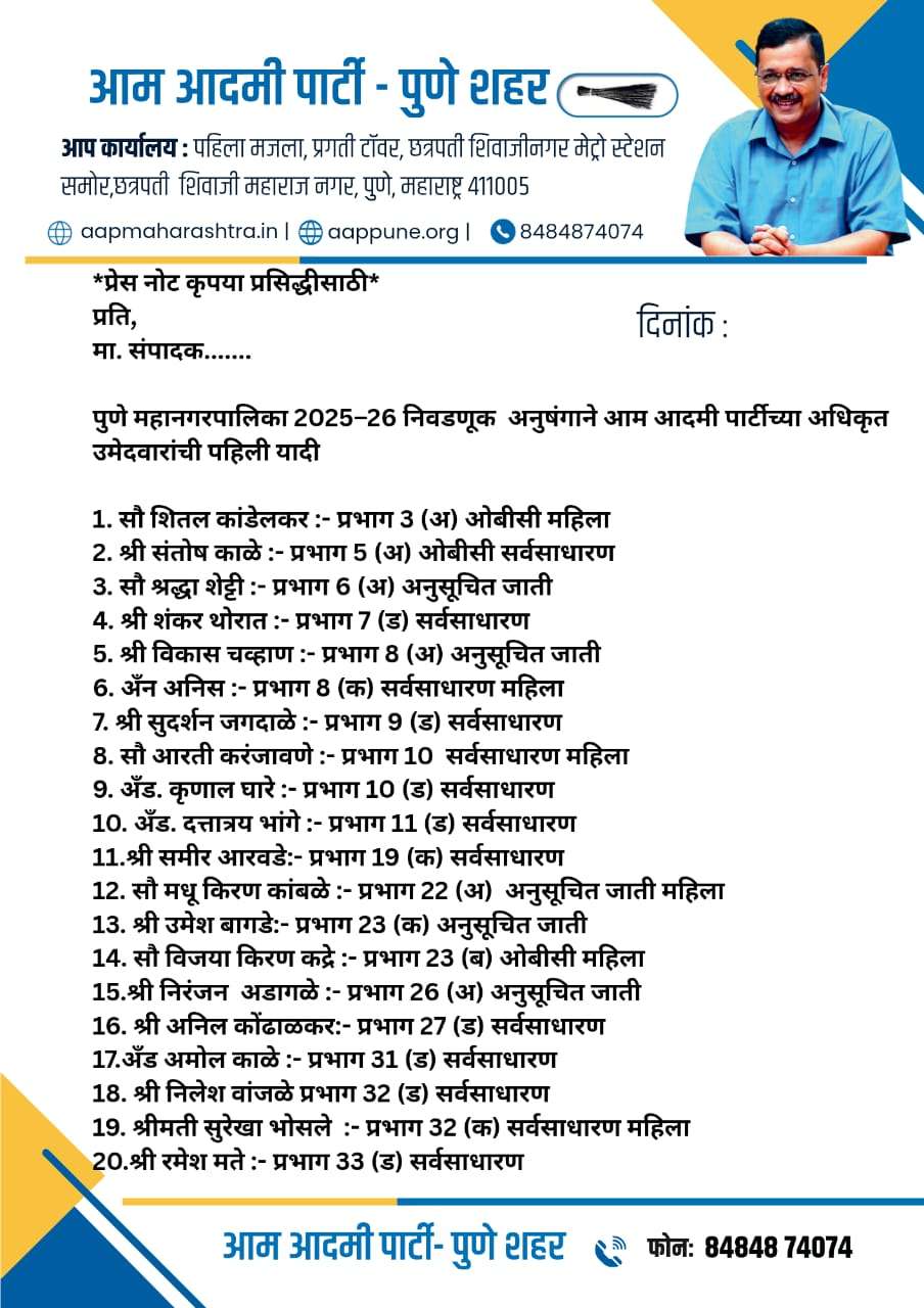 पुणे महानगरपालिका 2025–26 निवडणूक अनुषंगाने आम आदमी पार्टीच्या अधिकृत उमेदवारांची पहिली यादी