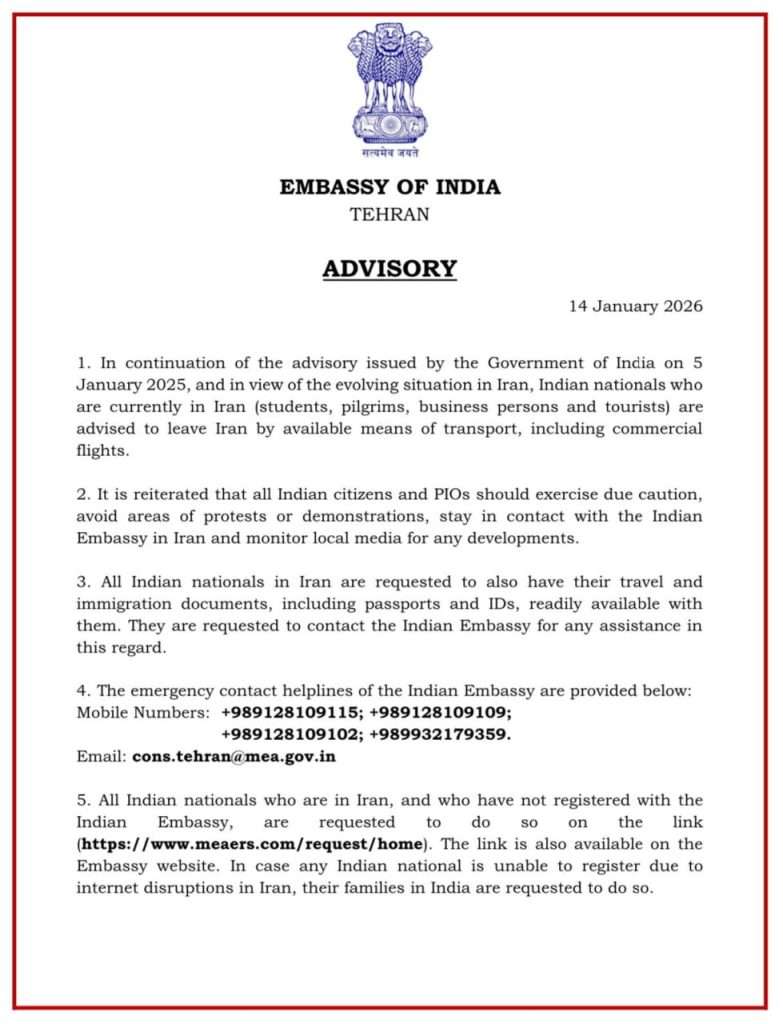 इराणमध्ये हिंसक निदर्शनांमुळे भारत सरकारने बुधवारी नागरिकांसाठी एक सल्लागार सूचना (अॅडव्हायझरी) जारी केली आहे. यात म्हटले आहे की, जे भारतीय नागरिक, मग ते विद्यार्थी असोत, तीर्थयात्री असोत, व्यापारी असोत किंवा पर्यटक असोत, सध्या इराणमध्ये आहेत, त्यांनी शक्य तितक्या लवकर तेथून बाहेर पडावे.या सल्लागार सूचनेत म्हटले आहे की, हा सल्ला 5 जानेवारीच्या मागील सल्लागार सूचनेचा पुढील भाग आहे आणि इराणमधील बदलत्या परिस्थिती लक्षात घेऊन देण्यात आला आहे.सरकारने हे देखील पुन्हा सांगितले आहे की, सर्व भारतीय नागरिकांनी सावधगिरी बाळगावी. त्यांनी निदर्शने किंवा गर्दीच्या ठिकाणांपासून दूर राहावे.इराणमध्ये असलेल्या भारतीय नागरिकांनी भारतीय दूतावासाच्या संपर्कात राहावे आणि स्थानिक माध्यमांवर लक्ष ठेवावे जेणेकरून कोणत्याही नवीन माहितीची त्यांना जाणीव होईल.