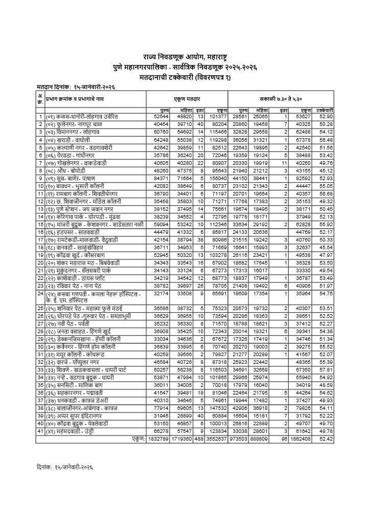 पुणे महापालिकेच्या निवडणुकीसाठी आज ४१ प्रभागांमध्ये मतदान प्रक्रिया पार पडली. रात्री साडेबारापर्यंत मतदानाची अंतिम टक्केवारी प्राप्त होऊ शकली नाही. मात्र पहाटे 4 वाजता महापालिकेने, शहरात सुमारे 52.42 टक्के इतके मतदान झाले असल्याचे जाहीर केले आहे.२०१७ च्या निवडणुकीच्या तुलनेत २०२६ मध्ये सुमारे पावणेचार लाख मतदारांची नव्याने भर पडल्याने त्याचा फायदा कोणत्या पक्षाला होणार, याची स्पष्टता आज येणार आहे.रात्रीचे साडेबारा वाजून गेले तरी महापालिका प्रशासनाला अंतिम टक्केवारी जाहीर करता आली नव्हती . २०१७ च्या निवडणुकीमध्ये पुणे शहरात ५५.६० टक्के इतके मतदान झाले होते.