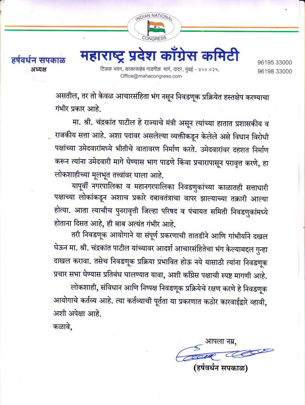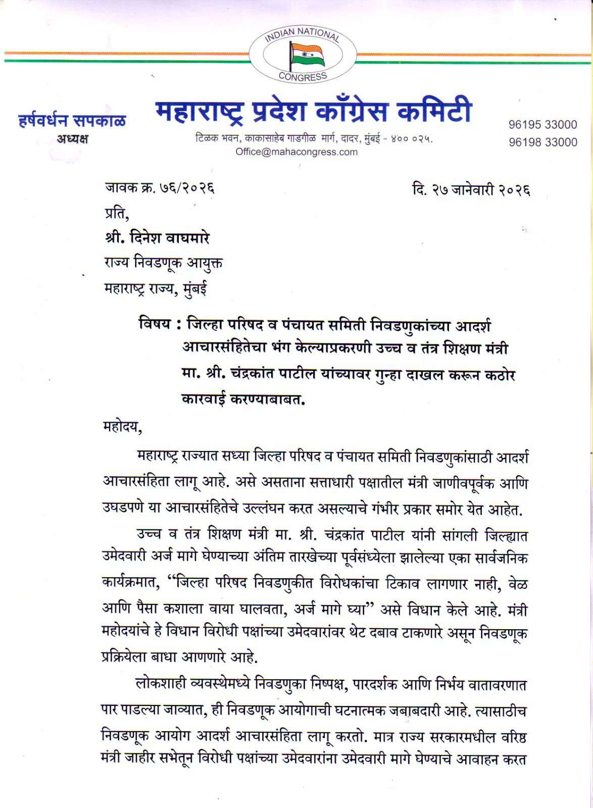 काँग्रेस प्रदेशाध्यक्ष हर्षवर्धन सपकाळ यांची राज्य निवडणूक आयुक्तांकडे पत्राद्वारे तक्रार.