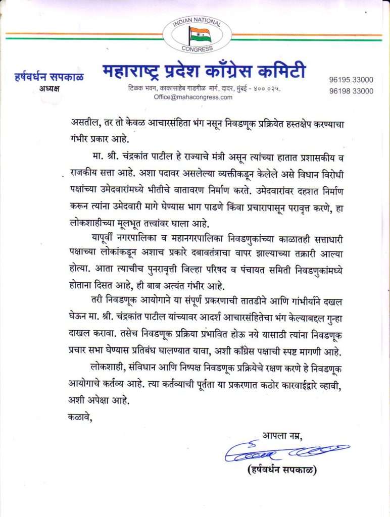 राज्यात सध्या जिल्हा परिषद व पंचायत समिती निवडणुकांसाठी आदर्श आचारसंहिता लागू आहे, असे असताना सत्ताधारी पक्षातील मंत्री जाणीवपूर्वक आणि उघडपणे या आचारसंहितेचे उल्लंघन करत असल्याचे गंभीर प्रकार समोर येत आहेत. उच्च व तंत्र शिक्षण मंत्री चंद्रकांत पाटील यांनी उमेदवारी अर्ज मागे घेण्याच्या अंतिम तारखेच्या पूर्वसंध्येला सांगली जिल्ह्यात झालेल्या एका सार्वजनिक कार्यक्रमात, “जिल्हा परिषद निवडणुकीत विरोधकांचा टिकाव लागणार नाही, वेळ आणि पैसा कशाला वाया घालवता, अर्ज मागे घ्या” असे विधान केले आहे. हे विधान विरोधी पक्षांच्या उमेदवारांवर थेट दबाव टाकणारे असून निवडणूक प्रक्रियेला बाधा आणणारे आहे, याची तातडीने आणि गांभीर्याने दखल घेऊन चंद्रकांत पाटील यांच्यावर आदर्श आचारसंहितेचा भंग केल्याबद्दल गुन्हा दाखल करावा तसेच निवडणूक प्रक्रिया प्रभावित होऊ नये यासाठी त्यांना निवडणूक प्रचार सभा घेण्यास प्रतिबंध घालण्यात यावा, अशी मागणी काँग्रेस प्रदेशाध्यक्ष हर्षवर्धन सपकाळ यांनी केली आहे.