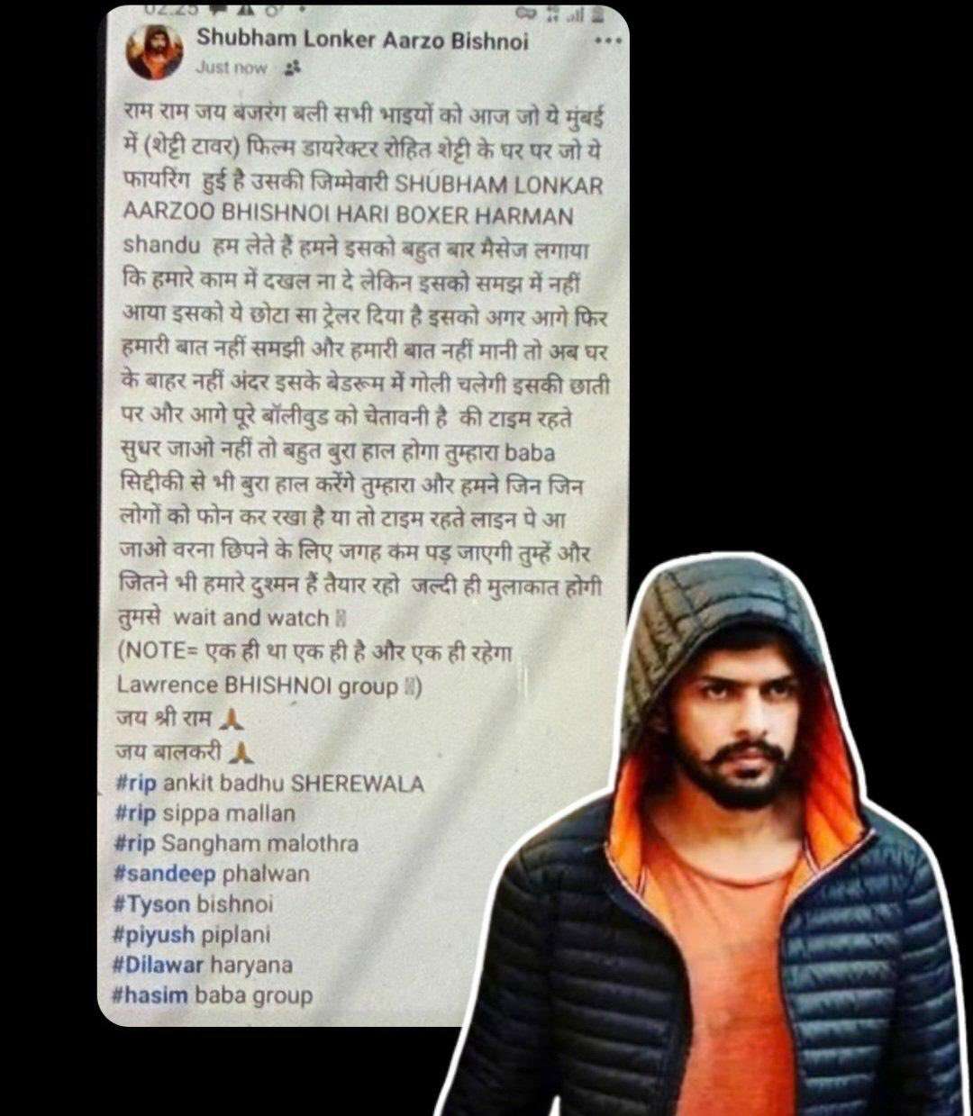 शुभम लोणकर आरजू बिश्नोई या नावाच्या फेसबुक आयडीवरच्या पोस्टमध्ये लिहिले आहे, “राम राम जय बजरंग बाली सर्व भाऊंना… आज मुंबईत (शेट्टी टॉवर) चित्रपट दिग्दर्शक रोहित शेट्टीच्या घरी जे गोळीबार झाले त्याची जबाबदारी SHUBHAM LONKER AARZOO BHISHNOI HARI BOXER HARMAN shandu आम्ही घेतो. आम्ही त्याला अनेकदा मेसेज दिले की आमच्या कामात हस्तक्षेप करू नका पण त्याला समजले नाही. त्याला हा छोटासा ट्रेलर दिला आहे. जर पुढेही आमची बोलणी समजली नाही आणि मानली नाही तर आता घराबाहेर नाही तर त्याच्या बेडरूममध्ये छातीवर गोळी चालेल आणि पुढे संपूर्ण बॉलिवूडला इशारा आहे की वेळीच सुधरून जा अन्यथा खूप वाईट हाल होईल तुमचा. बाबा सिद्दीकीपेक्षा वाईट हाल करू तुमचे.”जागा कमी पडेल