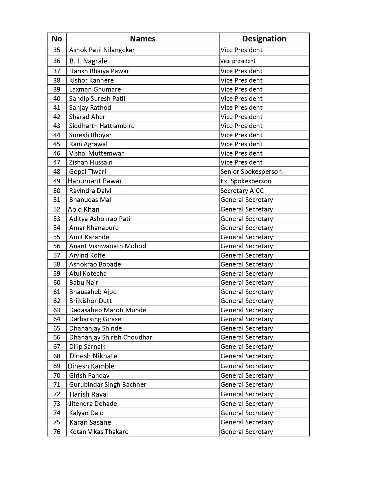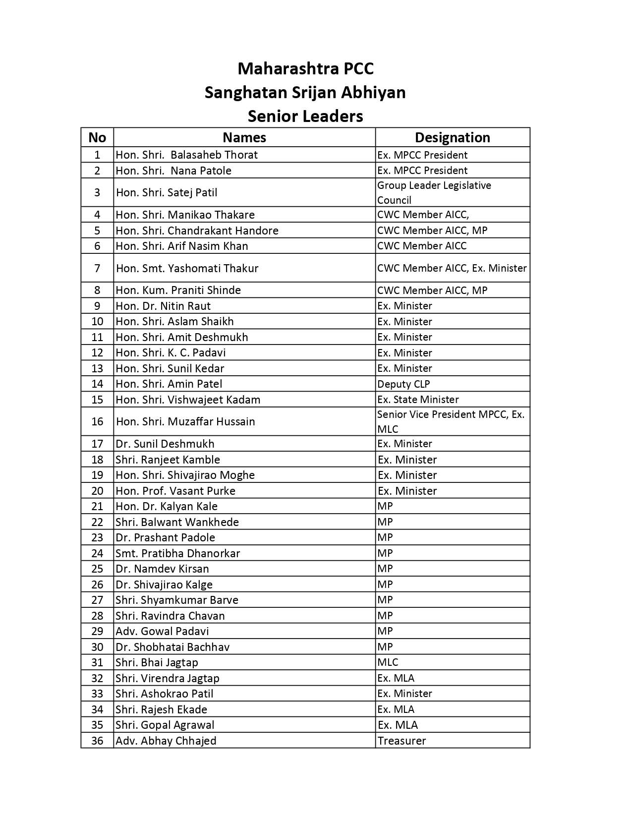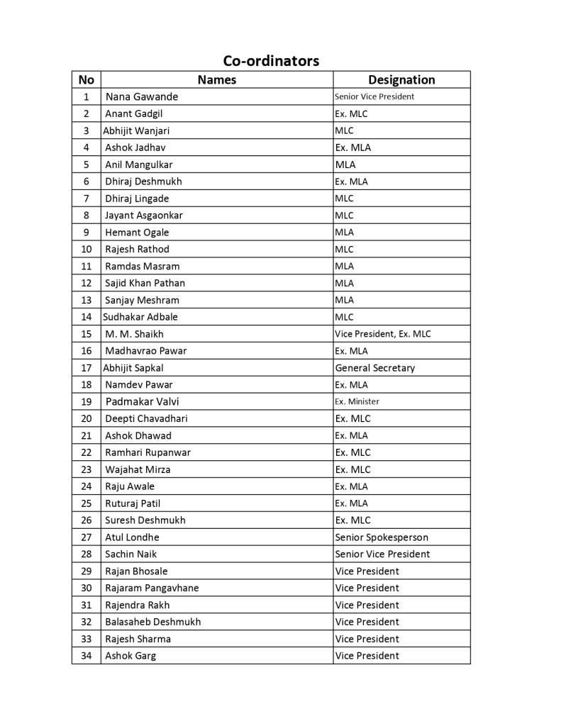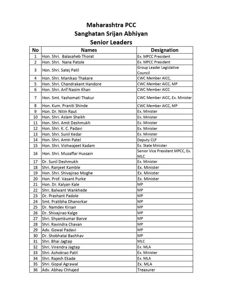 ज्येष्ठ नेते बाळासाहेब थोरात, माजी प्रदेशाध्यक्ष नाना पटोले, विधान परिषदेतील गटनेते सतेज पाटील, गोव्याचे प्रभारी माणिकराव ठाकरे, माजी मंत्री नसीम खान, अमित देशमुख, यशोमती ठाकूर, आ. डॉ. नितीन राऊत यांच्यासह माजी मंत्री, खासदार, आमदार व वरिष्ठ पदाधिकाऱ्यांसह १८३ सदस्यांचा या यादीत समावेश आहे.पुण्यातील रमेश बागवे,मोहन जोशी,अभय छाजेड, यांचा समावेश आहे तर अनंत गाडगीळ, दीप्ती चौधरी,गोपाळ तिवारी, प्रशांत जगताप यांचा समन्वयक म्हणून समावेश आहे.