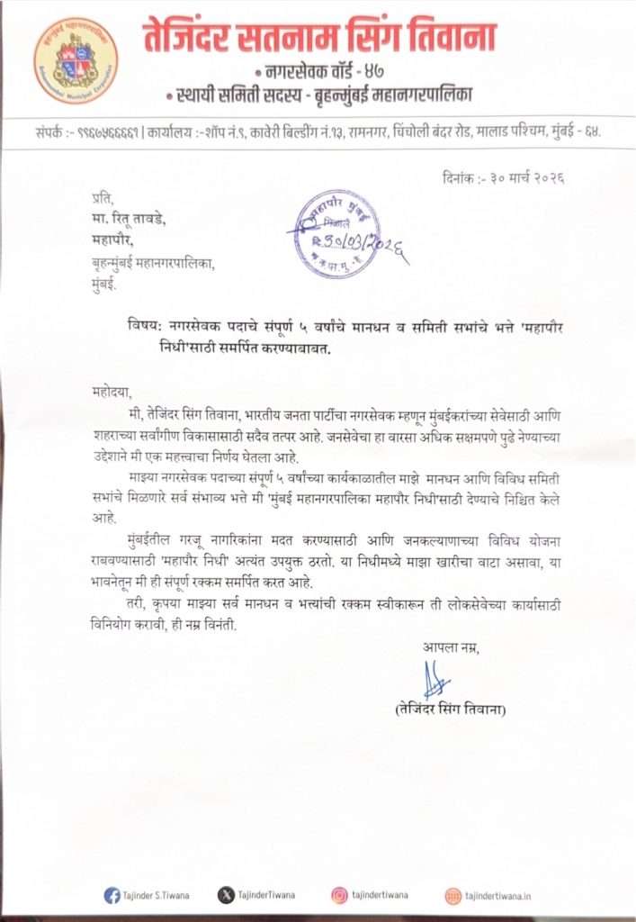 मुंबई- पुणे महापालिकेतील नगरसेवक राग्वेंद्र उर्फ बाप्पू मानकर यांनी आपले पहिल्या महिन्यापासुन चे मानधन लोकोपयोगी अर्थसहाय्यसाठी महापौर निधीला अर्पण केल्यानंतर आता अशाच प्रकारचा निर्णय बृहन्मुंबई महापालिकेतील नगरसेवक तेजिंदर सिंग तिवाना यांनीही घेतला आहे.