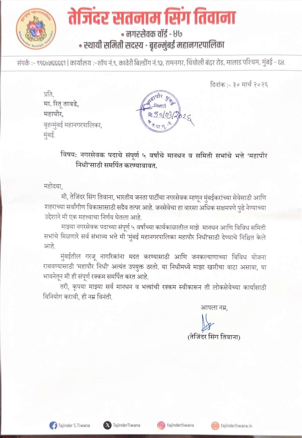 मुंबई- पुणे महापालिकेतील नगरसेवक राग्वेंद्र उर्फ बाप्पू मानकर यांनी आपले पहिल्या महिन्यापासुन चे मानधन लोकोपयोगी अर्थसहाय्यसाठी महापौर निधीला अर्पण केल्यानंतर आता अशाच प्रकारचा निर्णय बृहन्मुंबई महापालिकेतील नगरसेवक तेजिंदर सिंग तिवाना यांनीही घेतला आहे.
