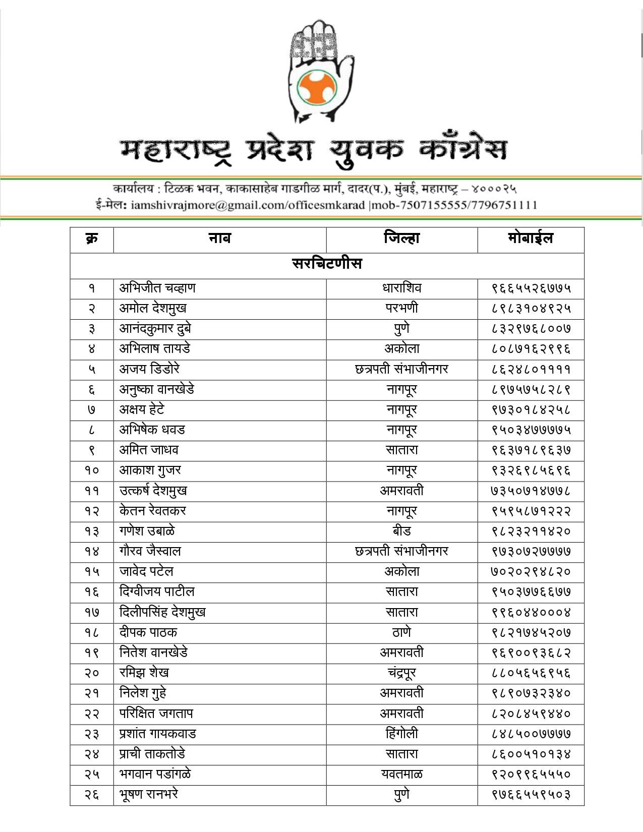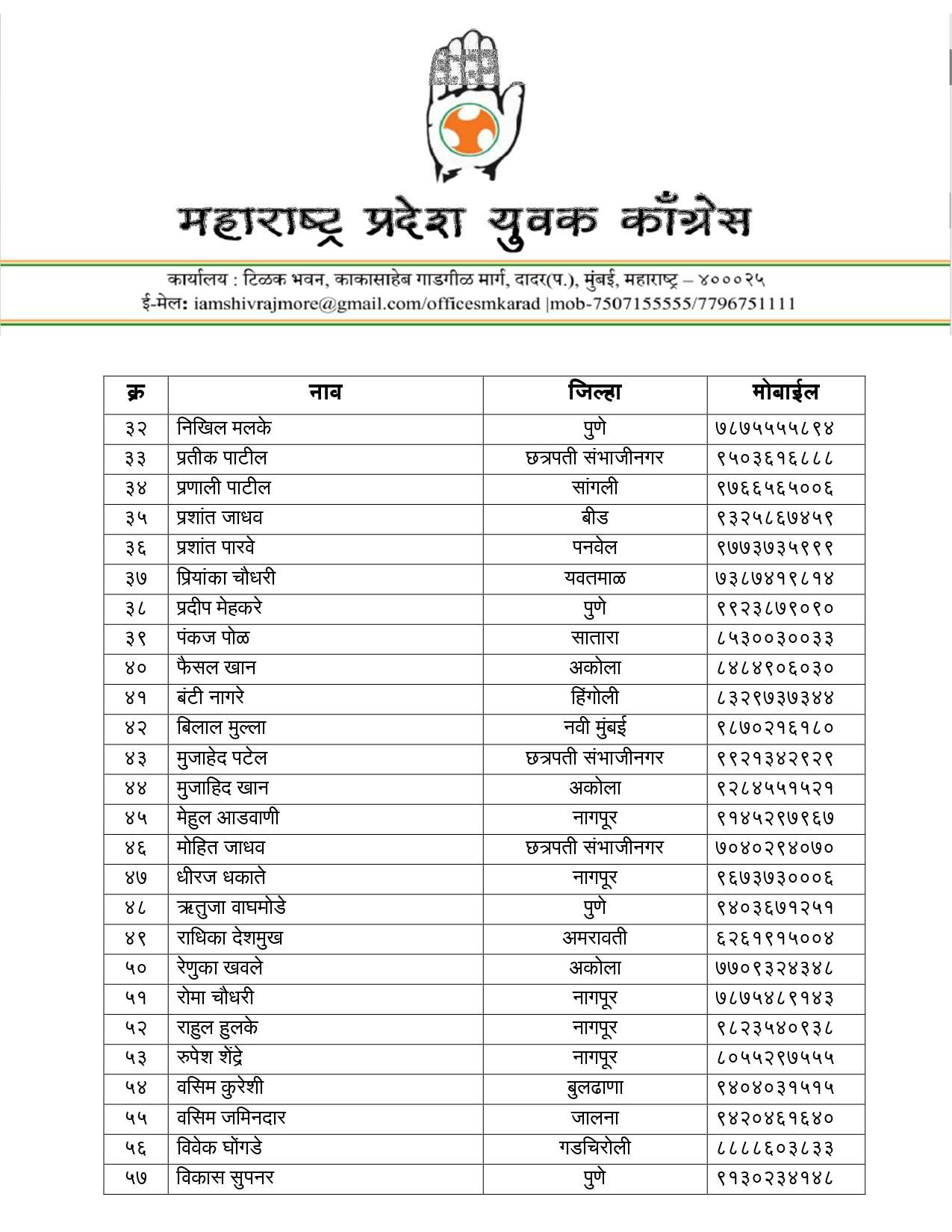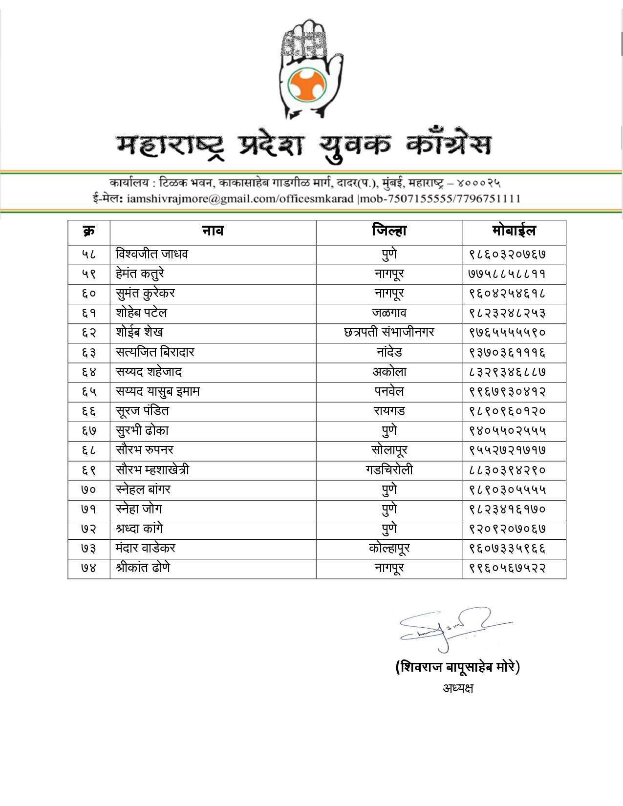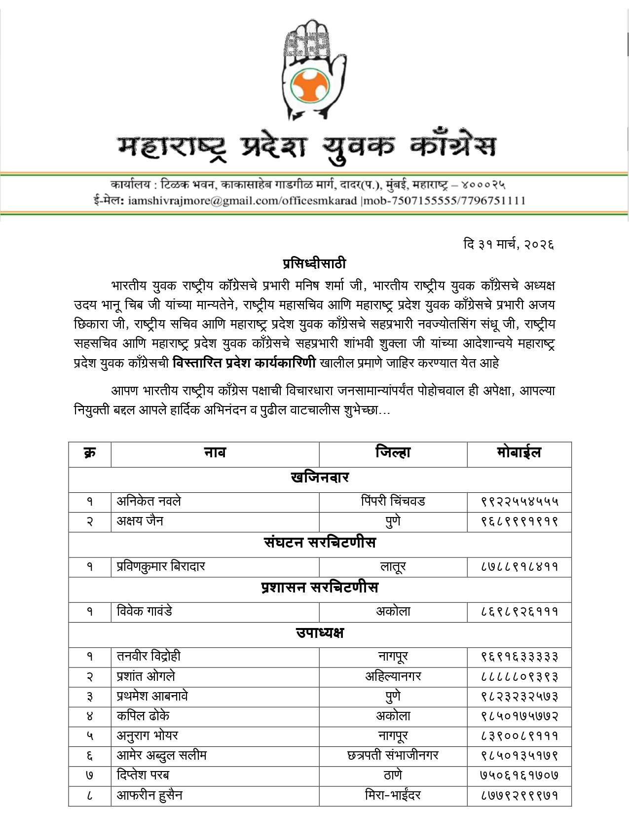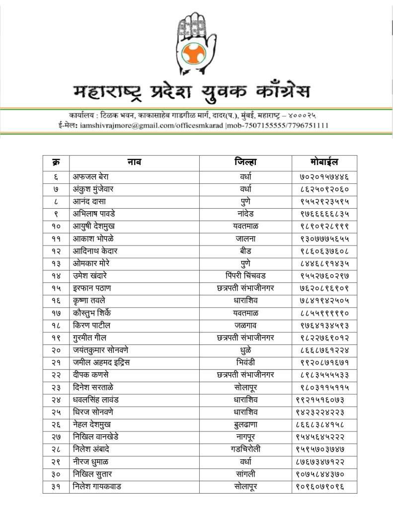 अखिल भारतीय युवक काँग्रेसचे राष्ट्रीय अध्यक्ष उदय भानू चिब यांच्या मान्यतेने महाराष्ट्र प्रदेश युवक काँग्रेसचे अध्यक्ष शिवराज मोरे यांनी आज महाराष्ट्र प्रदेश युवक काँग्रेसची नवी प्रदेश कार्यकारिणी जाहीर केली आहे. १२६ जणांच्या या कार्यकारिणीत खजिनदारपदी अनिकेत नवले व अक्षय जैन, संघटन सरचिटणीसपदी प्रविणकुमार बिरादार आणि प्रशासन सरचिटणीसपदी विवेक गावंडे यांची नियुक्ती करण्यात आली आहे.