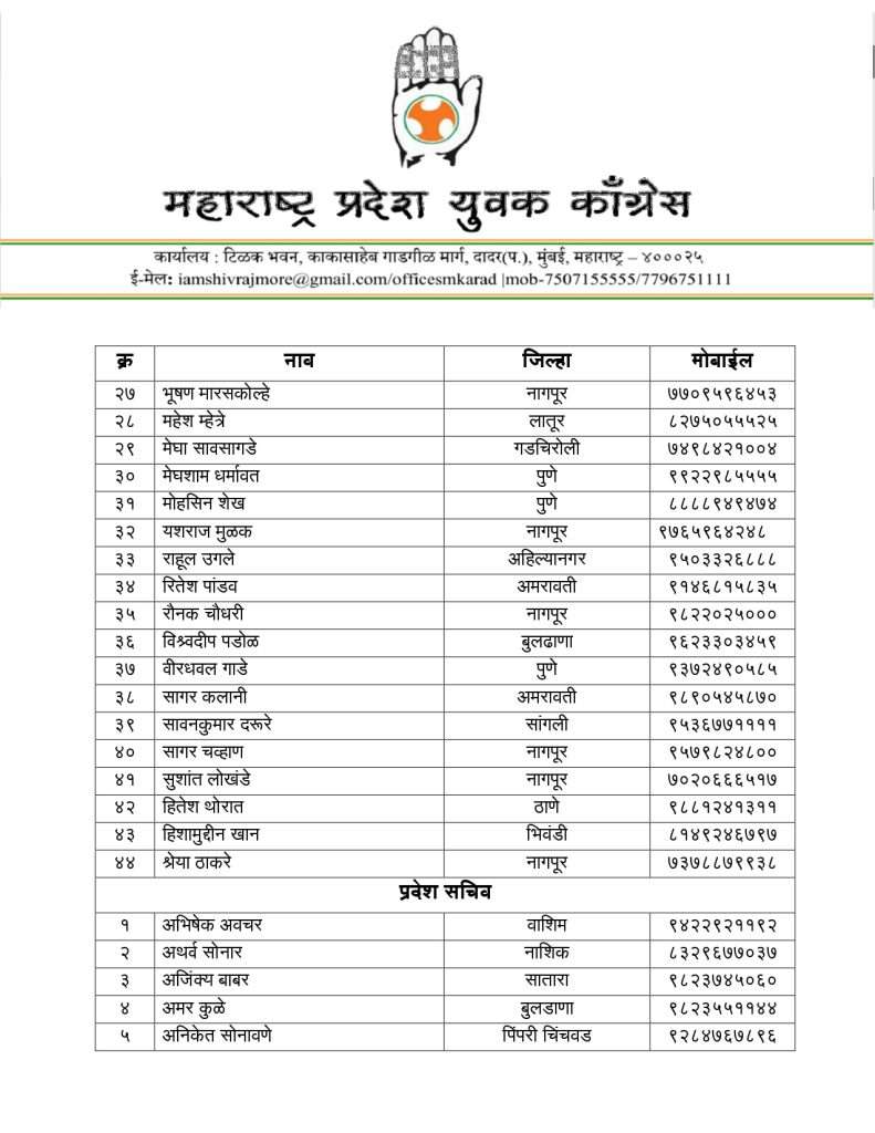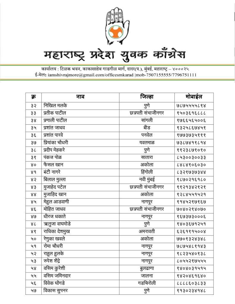 याशिवाय तनवीर विद्रोही, प्रशांत ओगले, प्रथमेश अबनावे, कपिल ढोके, अनुराग भोयर, आमेर अब्दुल सलीम, दिप्तेश परब, आफरीन हुसेन यांची उपाध्यक्ष पदी तसेच ४४ सरचिटणीस आणि ७४ प्रदेश सचिवांची नियुक्ती करण्यात आली आहे.