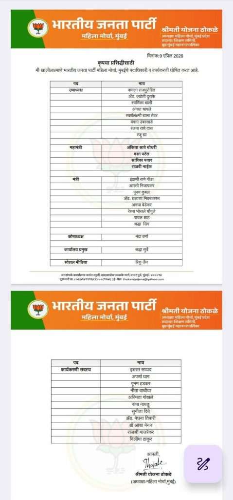 भारतीय जनता पक्ष महिला मोर्चा, मुंबईच्या पदाधिकारी व कार्यकरणीची यादी मुंबई भाजप अध्यक्ष, आमदार मान. श्री. अमीत साटम यांच्या मार्गदर्शनाखाली आज ९ एप्रिल २०२६ रोजी भाजप महिला मोर्चा अध्यक्षा श्रीमती योजना ठोकळे यांनी जाहीर केली. काही दिवसांपूर्वीच भाजप मुंबईच्या नव्या पदाधिकारी आणि युवा मोर्चा पदाधिकारी यांची यादी जाहीर झाली होती. त्यानंतर महिला मोर्चाची यादी अपेक्षित होती. त्याची घोषणा आज करण्यात आली.