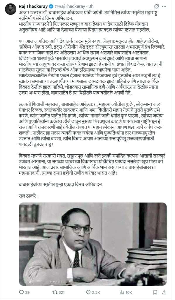 आज राज्यभरात डॉ. बाबासाहेब आंबेडकर यांचा जयंती दिवस उत्साहात साजरा केला जात आहे. यानिमित्ताने मुंबईतील चैत्यभूमीवर आंबेडकरी अनुयायांनी मोठ्याप्रमाणावर गर्दी केली आहे. राज्याचे मुख्यमंत्री देवेंद्र फडणवीस, उपमुख्यमंत्री एकनाथ शिंदे, उपमुख्यमंत्री सुनेत्रा पवार यांनी मंगळवारी सकाळी चैत्यभूमीवर जाऊन बाबासाहेब आंबेडकर यांना अभिवादन केले. तर दुसरीकडे मनसेप्रमुख राज ठाकरे यांनी सोशल मीडियावर आंबेडकर जयंतीनिमित्त एक खास पोस्ट शेअर केली आहे. या पोस्टमध्ये राज ठाकरे यांनी डॉ. बाबासाहेब आंबेडकर यांच्या कार्याविषयी आदर व्यक्त करताना तरुण पिढीला काही सल्ला देण्याचा प्रयत्न केला आहे. महापुरुषांच्या जयंत्या आणि पुण्यतिथ्या साजऱ्या करताना केवळ मिरवणुका काढण्यापेक्षा त्यापेक्षा पुढे जाऊन त्यांच्या वारशाचा आणि विचारांचा विचार केला पाहिजे, असे मत व्यक्त केले आहे.