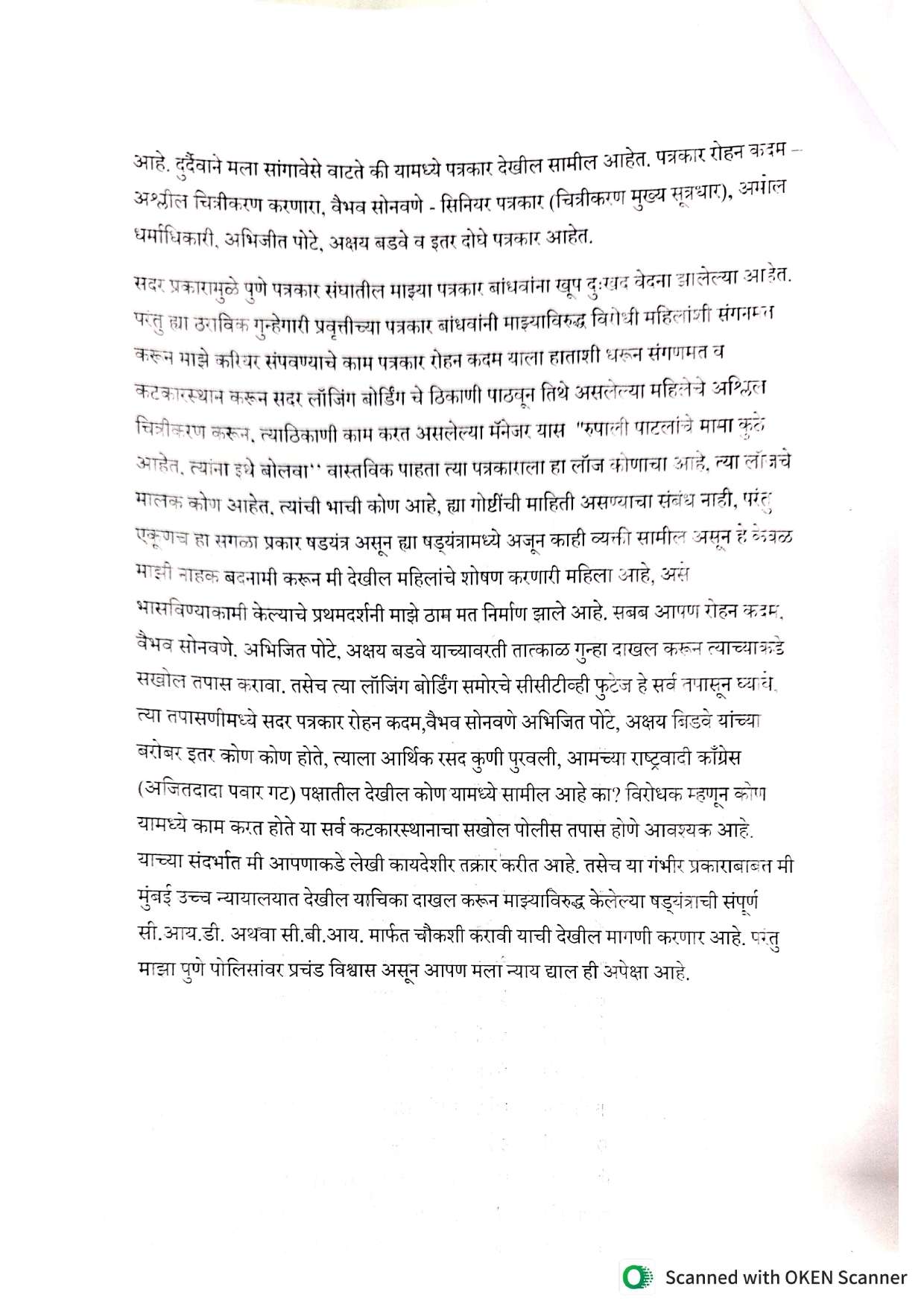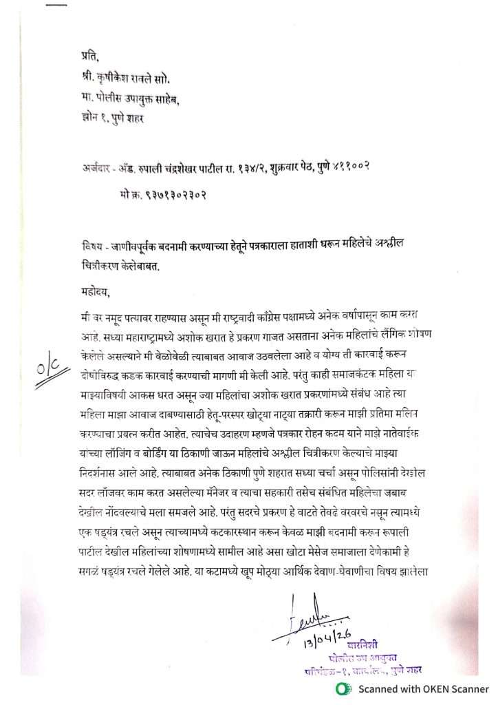 मी वर नमूद पत्यावर राहण्यास असून मी राष्ट्रवादी काँग्रेस पक्षामध्ये अनेक वर्षापासून काम करत आहे. सध्या महाराष्ट्रामध्ये अशोक खरात हे प्रकरण गाजत असताना अनेक महिलांचे लैंगिक शोषण केलेले असल्याने मी वेळोवेळी त्याबाबत आवाज उठवलेला आहे व योग्य ती कारवाई करून दोषीविरुद्ध कडक कारवाई करण्याची मागणी मी केली आहे. परंतु काही समाजकंटक महिला या माझ्याविषयी आकस धरत असून ज्या महिलांचा अशोक खरात प्रकरणांमध्ये संबंध आहे त्या महिला माझा आवाज दाबण्यासाठी हेतू-परस्पर खोट्या नाट्या तक्रारी करून माझी प्रतिमा मलिन करण्याचा प्रयत्न करीत आहेत. त्याचेच उदाहरण म्हणजे पत्रकार रोहन कदम याने माझे नातेवाईक यांच्या लॉजिंग व बोर्डिंग या ठिकाणी जाऊन महिलांचे अश्लील चित्रीकरण केल्याचे माझ्या निदर्शनास आले आहे. त्याबाबत अनेक ठिकाणी पुणे शहरात सध्या चर्चा असून पोलिसांनी देखोल सदर लॉजवर काम करत असलेल्या मॅनेजर व त्याचा सहकारी तसेच संबंधित महिलेचा जबाब देखील नोंदवल्याचे मला समजले आहे. परंतु सदरचे प्रकरण हे वाटते तेवढे वरवरचे नसून त्यामध्ये एक षड्यंत्र रचले असून त्याच्यामध्ये कटकारस्थान करून केवळ माझी बदनामी करून रूपाली पाटील देखील महिलांच्या शोषणामध्ये सामील आहे असा खोटा मेसेज समाजाला देणेकामी हे सगळं षड्यंत्र रचले गेलेले आहे. या कटामध्ये खूप मोठ्या आर्थिक देवाण-घेवाणीचा विषय झालेला आहे. दुर्दैवाने मला सांगावेसे वाटते की यामध्ये पत्रकार देखील सामील आहेत. पत्रकार रोहन कदम -अश्लील चित्रीकरण करणारा, वैभव सोनवणे सिनियर पत्रकार (चित्रीकरण मुख्य सूत्रधार), अमोल धर्माधिकारी, अभिजीत पोटे, अक्षय बडवे व इतर दोघे पत्रकार आहेत.