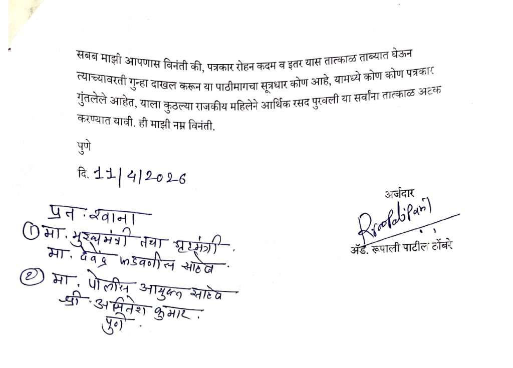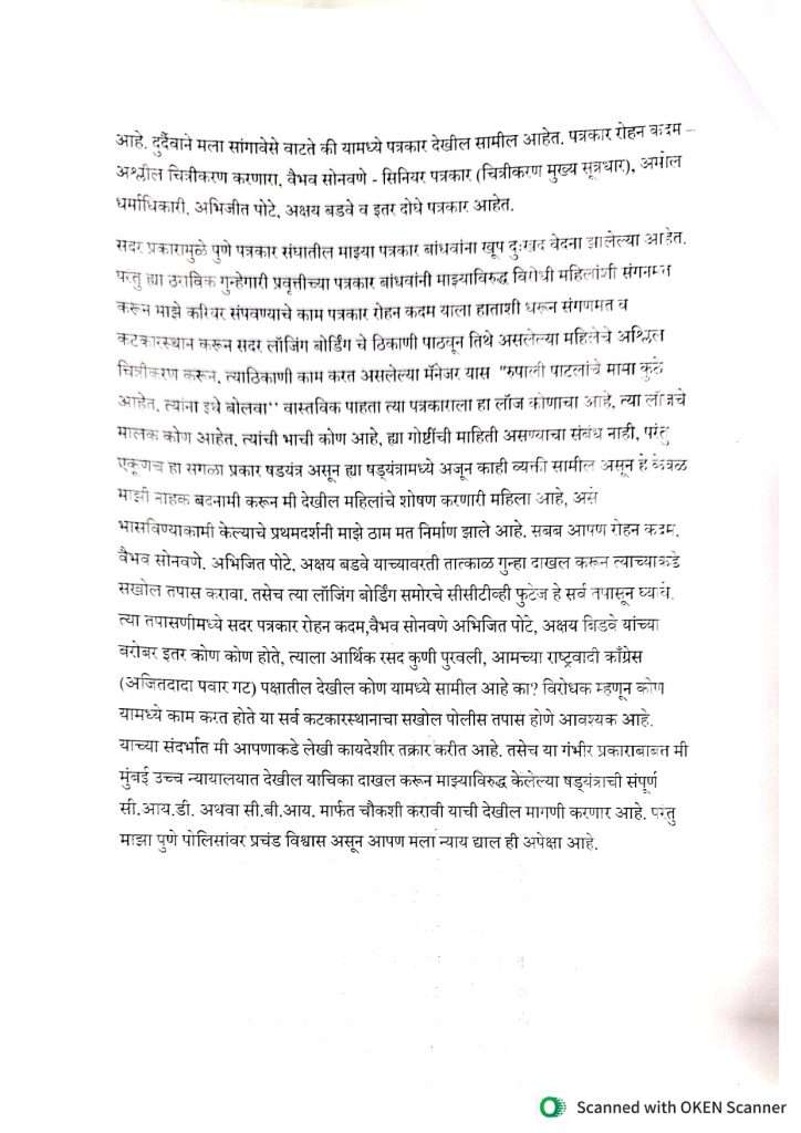 सदर प्रकारामुळे पुणे पत्रकार संघातील माझ्या पत्रकार बांधवांना खूप दुःखद वेदना झालेल्या आहेत. परंतु ह्या ठराविक गुन्हेगारी प्रवृत्तीच्या पत्रकार बांधवांनी माझ्याविरुद्ध विरोधी महिलांशी संगनम्न करून माझे करिचर संपवण्याचे काम पत्रकार रोहन कदम याला हाताशी धरून संगणमत व कटकारस्थान करून सदर लॉजिंग बोर्डिंग चे ठिकाणी पाठवून तिथे असलेल्या महिलेचे अश्लिल चित्रीकरण करून, त्याठिकाणी काम करत असलेल्या मॅनेजर यास “रुपाली पाटलांचे मामा कुठे आहेत, त्यांना इथे बोलवा” वास्तविक पाहता त्या पत्रकाराला हा लॉज कोणाचा आहे, त्या लॉजचे मालक कोण आहेत, त्यांची भाची कोण आहे, ह्या गोष्टींची माहिती असण्याचा संबंध नाही, परंतु एकूणच हा सगळा प्रकार षडयंत्र असून ह्या षड्यंत्रामध्ये अजून काही व्यक्ती सामील असून हे केवळ माझी नाहक बदनामी करून मी देखील महिलांचे शोषण करणारी महिला आहे, असे भासविण्याकामी केल्याचे प्रथमदर्शनी माझे ठाम मत निर्माण झाले आहे. सबब आपण रोहन कदम, वैभव सोनवणे, अभिजित पोटे, अक्षय बडवे याच्यावरती तात्काळ गुन्हा दाखल करून त्याच्याकडे सखोल तपास करावा. तसेच त्या लॉजिंग बोर्डिंग समोरचे सीसीटीव्ही फुटेज हे सर्व तपासून घ्यावे. त्या तपासणीमध्ये सदर पत्रकार रोहन कदम, वैभव सोनवणे अभिजित पोटे, अक्षय बिडवे यांच्या वरोबर इतर कोण कोण होते, त्याला आर्थिक रसद कुणी पुरवली, आमच्या राष्ट्रवादी काँग्रेस (अजितदादा पवार गट) पक्षातील देखील कोण यामध्ये सामील आहे का? विरोधक म्हणून कोण यामध्ये काम करत होते या सर्व कटकारस्थानाचा सखोल पोलीस तपास होणे आवश्यक आहे. याच्या संदर्भात मी आपणाकडे लेखी कायदेशीर तक्रार करीत आहे. तसेच या गंभीर प्रकाराबाबत मी मुंबई उच्च न्यायालयात देखील याचिका दाखल करून माझ्याविरुद्ध केलेल्या षड्यंत्राची संपूर्ण सी.आय.डी. अथवा सी.बी.आय. मार्फत चौकशी करावी याची देखील मागणी करणार आहे. परतु माझा पुणे पोलिसांवर प्रचंड विश्वास असून आपण मला न्याय द्याल ही अपेक्षा आहे.सबब माझी आपणास विनंती की. पत्रकार रोहन कदम व इतर यास तात्काळ ताब्यात घेऊन त्याच्यावरती गुन्हा दाखल करून या पाठीमागचा सूत्रधार कोण आहे. यामध्ये कोण कोण पत्रकार गुंतलेले आहेत, याला कुठल्या राजकीय महिलेने आर्थिक रसद पुरवली या सर्वांना तात्काळ अटक करण्यात यावी. ही माझी नम्र विनंती.