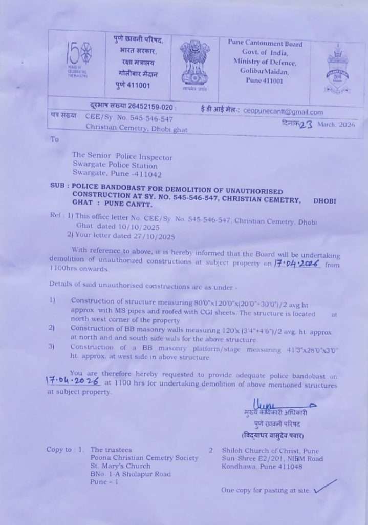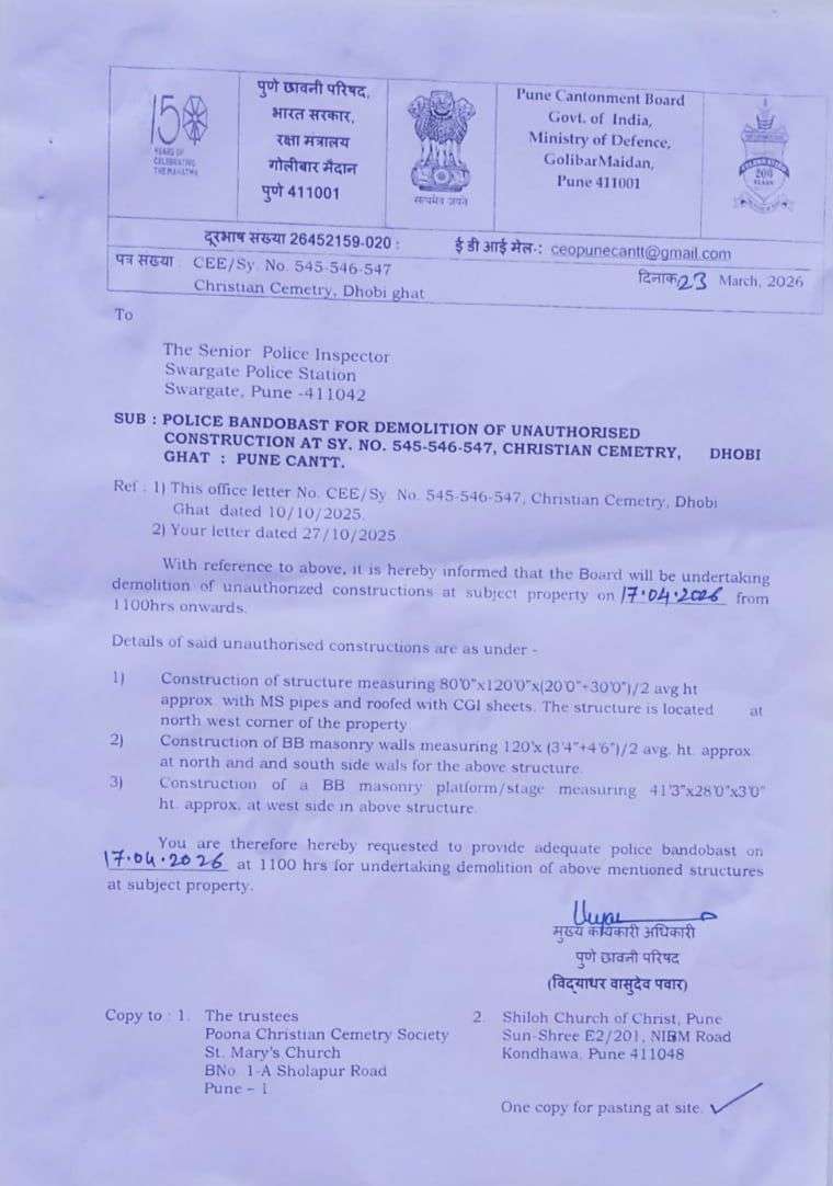 या नुसार काल १७ एप्रिल २०२६ रोजी पुणे कॅन्टोन्मेंट बोर्डाच्या वतीने शिलोह मराठी चर्च ऑफ ख्राईस्ट, धोबी घाट, कॅन्टोन्मेंट अग्निशामक केंद्र शेजारी, शंकरशेठ रोड येथील चर्चवर पाडकामाची (demolition) नोटीस देऊन प्रत्यक्ष कारवाईसाठी अधिकारी जेसीबी व इतर यंत्रसामग्रीसह दाखल झाले.मात्र या कारवाईच्या विरोधात मोठ्या संख्येनेपुरुष , महिला वर्ग तसेच विविध स्तरांतील नागरिक घटनास्थळी एकत्र जमले. उपस्थित नागरिकांनी शांततापूर्ण मार्गाने या कारवाईचा निषेध नोंदवून चर्चला पाठिंबा दर्शविला. तसेच अॅड. तोसिफ शेख यांनी चर्चच्या वतीने कायदेशीर बाजू मांडत व इतरांनी कॅन्टोन्मेंट बोर्डाचे CEO यांच्याशी चर्चा केली. या चर्चेनंतर कॅन्टोन्मेंट बोर्डाकडून सकारात्मक प्रतिसाद मिळून पाडकामाच्या कारवाईस सोमवारपर्यंत स्थगिती (stay) देण्यात आली आहे.