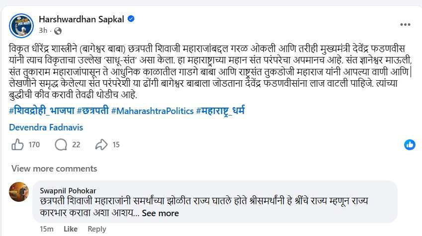 भोंदूबाबा धीरेंद्र शास्त्री छत्रपती शिवाजी महाराजांचा अपमान करत असताना मुख्यमंत्री, गडकरी व मोहन भागवत गप्प का? असा सवाल उपस्थित करत हर्षवर्धन सपकाळ यांनी छत्रपतींबद्दल गरळ ओकायला सांगणारा मालक एकच, असे म्हणत मुख्यमंत्र्यांनाच आरोपीच्या पिंजऱ्यात उभे केले आहे. या प्रकरणी त्यांनी एक फोटो पोस्ट केला आहे. त्यात धीरेंद्र शास्त्री व महाराष्ट्राचे माजी राज्यपाल भगतसिंह कोश्यारी दिसत आहेत. छत्रपती शिवाजी महाराजांचा अपमान करणे हे भाजपा RSS चे राष्ट्रीय धोरण आहे. महाराजांचे विचार व कर्तृत्व त्यांना मान्य नाही. त्यामुळे शिवरायांच्या अवमानाबद्दल धीरेंद्र शास्त्रींसह मुख्यमंत्री फडणवीस, नितीन गडकरी व सरसंघचालकांनी जाहीर माफी मागावी, अशी मागणीही सपकाळ यांनी या प्रकरणी केली आहे.