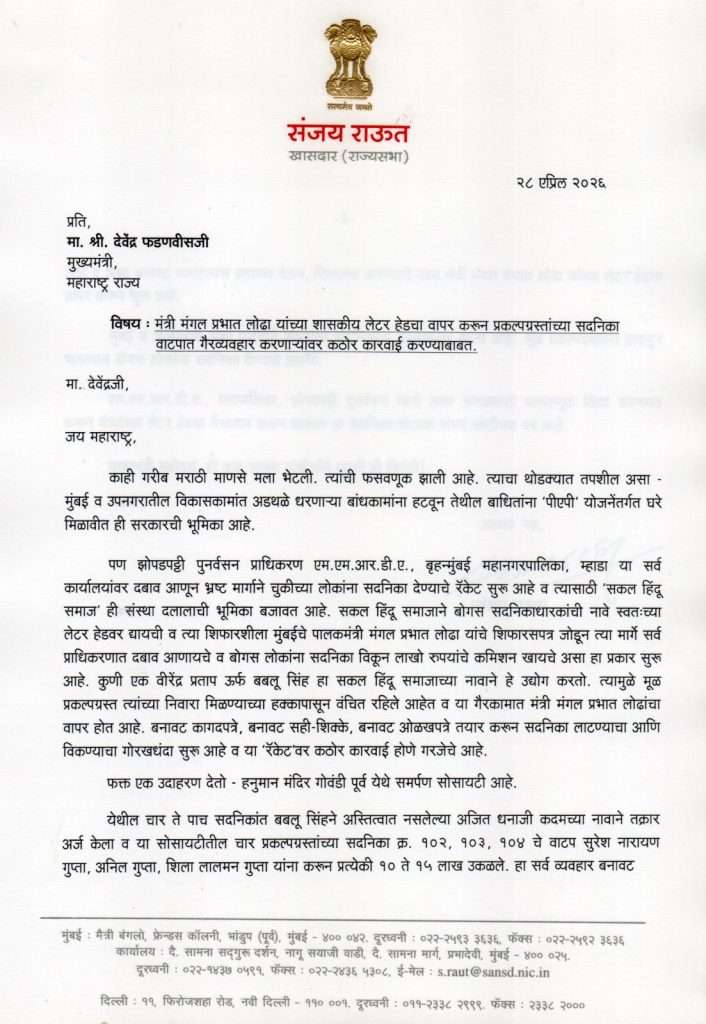 मुंबई-मुंबई आणि उपनगरातील प्रकल्पग्रस्तांसाठी असलेल्या सदनिकांच्या वाटपात १०० कोटी रुपयांहून अधिकचा मोठा घोटाळा सुरू असल्याचा खळबळजनक आरोप शिवसेना उद्धव बाळासाहेब ठाकरे पक्षाचे खासदार संजय राऊत यांनी केला आहे. या संदर्भात त्यांनी आज, २८ एप्रिल २०२६ रोजी मुख्यमंत्री देवेंद्र फडणवीस यांना सविस्तर पत्र लिहून या प्रकरणातील ‘रॅकेट’वर कठोर कारवाई करण्याची मागणी केली आहे. विशेष म्हणजे, या घोटाळ्यासाठी मुंबईचे पालकमंत्री मंगल प्रभात लोढा यांच्या शासकीय लेटरहेडचा गैरवापर केला जात असल्याचा दावा संजय राऊत यांनी पत्रात केला आहे.