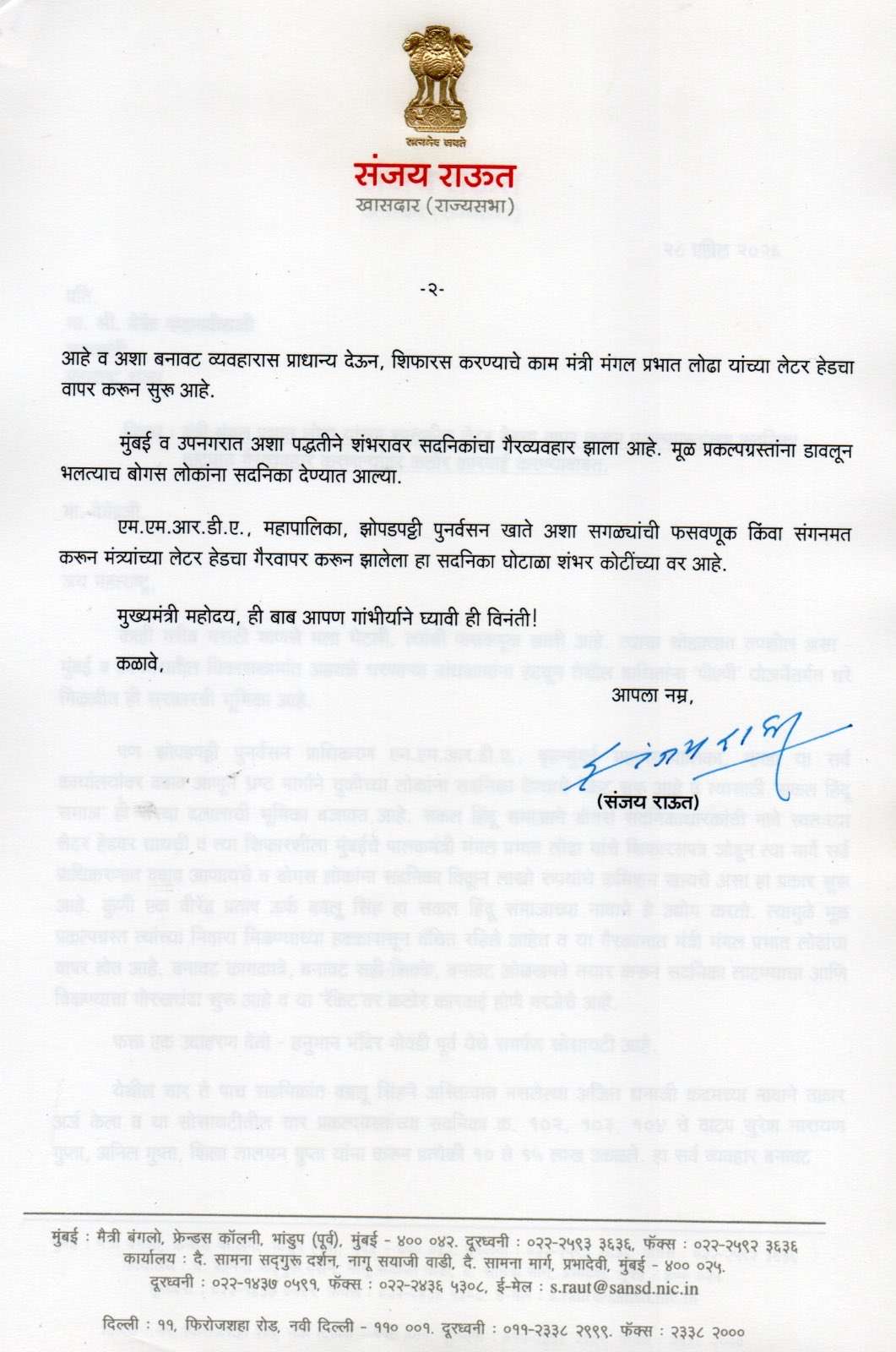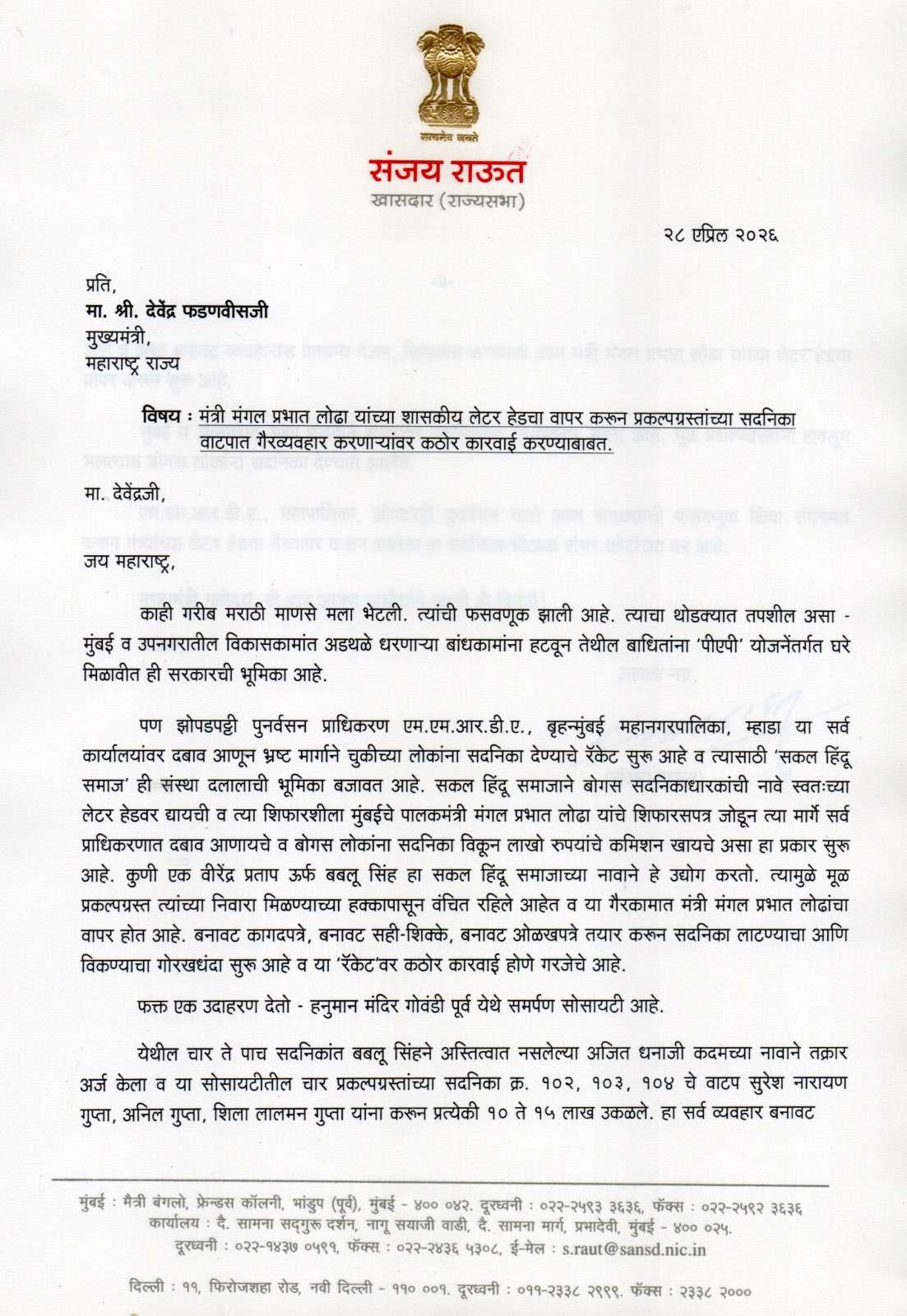 “मंत्री मंगल प्रभात लोढा यांच्या लेटरहेडचा वापर करून सुरू असलेला हा सदनिका घोटाळा अत्यंत गंभीर असून, गरीब मराठी माणसांची फसवणूक केली जात आहे. मुख्यमंत्री महोदयांनी या बाबीची गांभीर्याने दखल घेऊन या ‘रॅकेट’चा पर्दाफाश करावा आणि दोषींवर कठोर कारवाई करावी,” अशी विनंती संजय राऊत यांनी पत्राच्या शेवटी केली आहे.