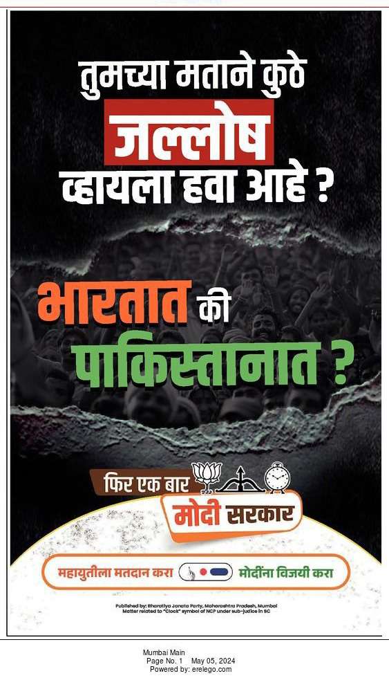 महाराष्ट्र प्रदेश काँग्रेस कमिटीचे मुख्य प्रवक्ते अतुल लोंढे यांच्या नेतृत्त्वाखाली काँग्रेस पक्षाच्या शिष्टमंडळाने आज राज्याच्या अतिरिक्त मुख्य निवडणूक अधिकाऱ्यांची भेट घेऊन भारतीय जनता पक्षाने आज वर्तमानपत्रात दिलेल्या जाहिराती विरोधात तक्रार केली. यावेळी माध्यमांशी बोलताना अतुल लोंढे म्हणाले की पहिल्या दोन टप्प्यात झालेले मतदान आपल्या विरोधात झाले आहे याची जाणिव झाल्याने पंतप्रधान नरेंद्र मोदी आता धार्मिक अजेंडा आणि पाकिस्तानला निवडणूक प्रचारात घेऊन आले आहेत. आज एका आघाडीच्या दैनिकात पहिल्या पानावर तुमच्या मताने कुठे जल्लोष व्हायला हवा आहे भारतात की पाकिस्तानात अशी जाहिरात दिली आहे. हा मतदारांची दिशाभूल करण्याचा प्रकार आहे. भारतीय जनता पक्षाला भारत आणि पाकिस्तान मधला फरक कळत नाही का? असा संतप्त सवाल करून पंतप्रधान हतबल, निराश आणि वैफल्यग्रस्त झाले आहेत. १० वर्षात जनतेच्या हिताचे काही केले नाही त्यामुळे मतं मागण्यासाठी त्यांना पाकिस्तानचा आधार घ्यावा लागत आहे. पाकिस्तान मध्ये जाऊन बिर्यानी खाणारा, पाकिस्तानी गुप्तहेर संस्था आयएसआयला पठाणकोट येथे बोलावणारा पंतप्रधान पाहिजे की, चीनसमोर निधड्या छातीने उभा राहणारा, मणिपूर मध्ये जाऊन पीडितांची सांत्वन करणारा, कन्याकुमारी ते श्रीनगर अशी पायी भारत जोडो यात्रा काढणारा पंतप्रधान पाहिजे अशी जाहिरात आम्हीही देऊ शकतो पण आमच्याकडे कार्यक्रम आहे. त्यामुळे आम्हाला अशी गोष्टींची आवश्यकता नाही.