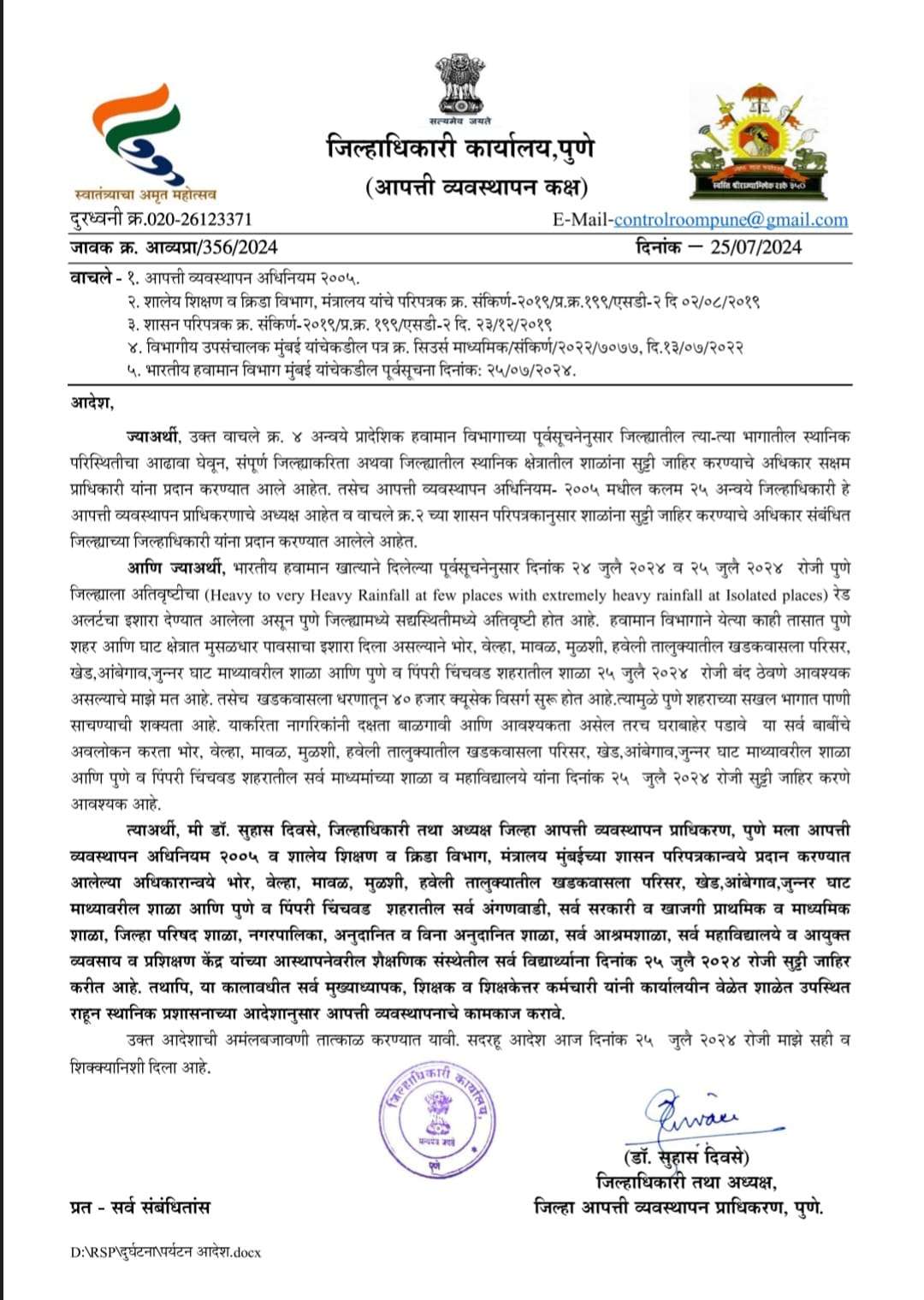 हवामान विभागाने येत्या काही तासात पुणे शहर आणि घाट क्षेत्रात मुसळधार पावसाचा इशारा दिला असल्याने भोर, वेल्हा, मावळ, मुळशी, हवेली तालुक्यातील खडकवासला परिसर आणि पुणे शहरातील शाळा २५ जुलै रोजी बंद ठेवण्याचे आदेश जिल्हाधिकारी तथा जिल्हा आपत्ती व्यवस्थापन प्राधिकरणाचे अध्यक्ष डॉ.सुहास दिवसे यांनी दिले आहेत. खडकवासला धरणातून ४० हजार क्यूसेक विसर्ग सुरू होत आहे. तसेच पुणे शहराच्या सखल भागात पाणी साचण्याची शक्यता आहे. त्यामुळे नागरिकांनी दक्षता बाळगावी आणि आवश्यकता असेल तरच घराबाहेर पडावे असे आवाहन जिल्हाधिकारी डॉ.दिवसे यांनी केले आहे.