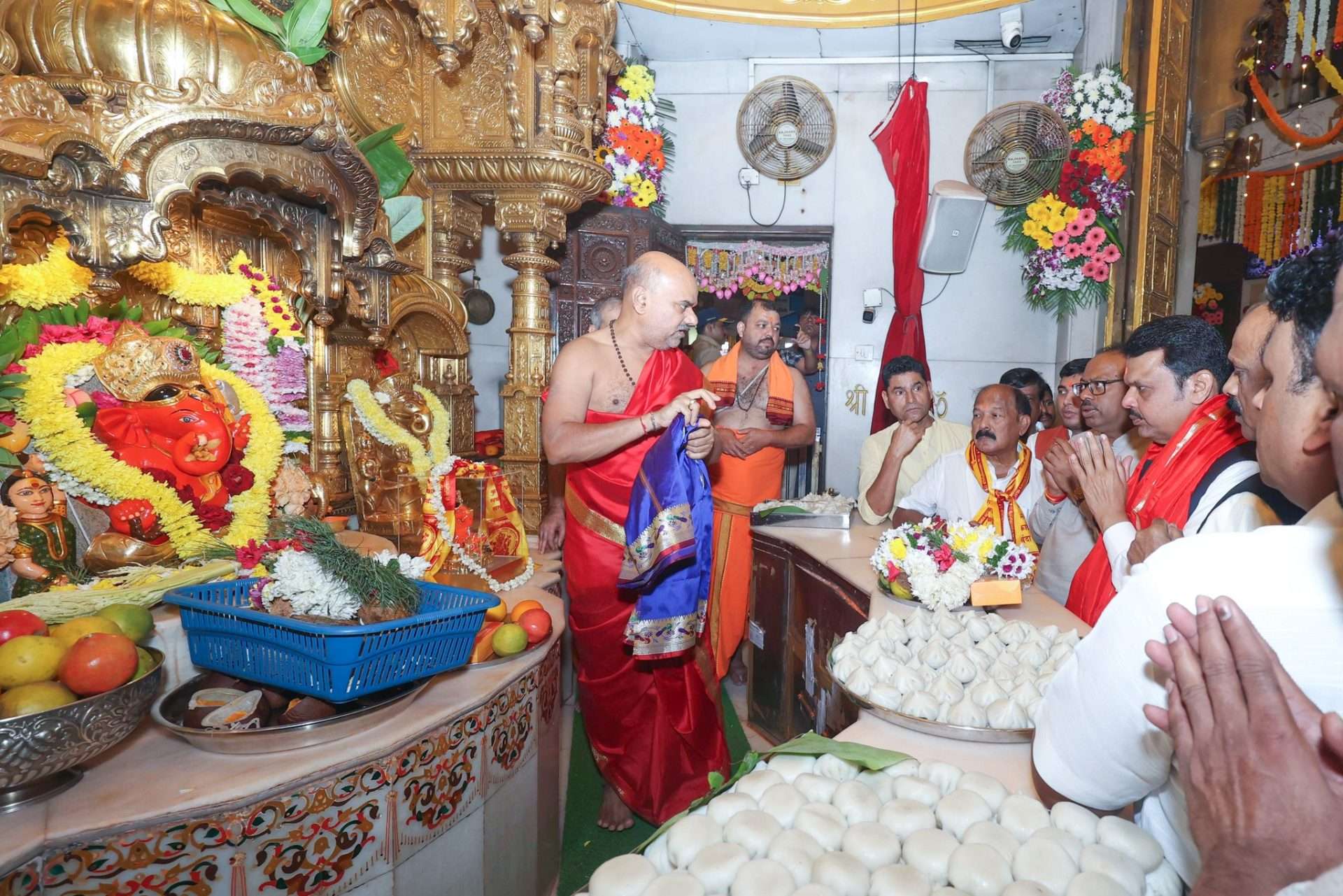 देवेंद्र फडणवीस यांनी दादर येथील सिद्धिविनायक मंदिरात जात दर्शन घेतले. शपथविधीपूर्वी फडणवीस यांनी श्रीगणरायाचरणी प्रार्थना केली. यावेळी त्यांच्यासोबत गिरीश महाजन देखील उपस्थित होते.देवेंद्र फडणवीस यांनी शपथविधीपूर्वी गोमातेचे पूजन करुन आर्शीवाद घेतले.मुंबादेवी मंदिरातही फडणवीसांनी दर्शन घेतले.