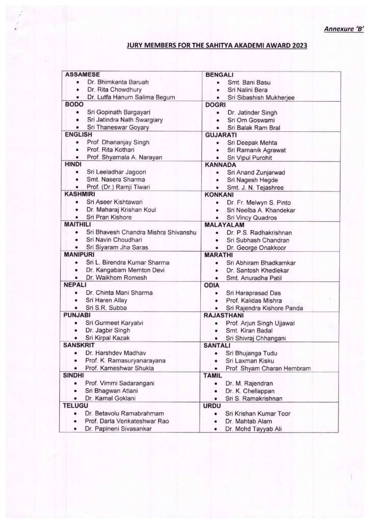 24 भारतीय भाषांमधील प्रतिष्ठित परीक्षक सदस्यांनी शिफारस केलेल्या पुरस्कारांना साहित्य अकादमीच्या कार्यकारी मंडळाने 20 डिसेंबर 2023 रोजी साहित्य अकादमीचे अध्यक्ष माधव कौशिक यांच्या अध्यक्षतेखाली झालेल्या बैठकीत मंजुरी दिली.