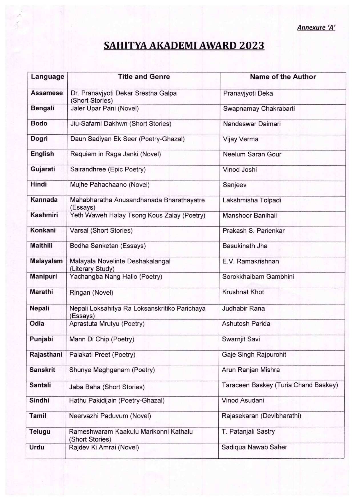 साहित्य अकादमीने 24 भाषांमधील वार्षिक साहित्य अकादमी पुरस्कारांची घोषणा केली आहे. 2023 सालचे साहित्य अकादमी पुरस्कार 9 कविता संग्रह, 6 कादंबऱ्या, 5 लघुकथा, 3 निबंध आणि 1 साहित्यिक अभ्यासाला मिळाले आहेत.