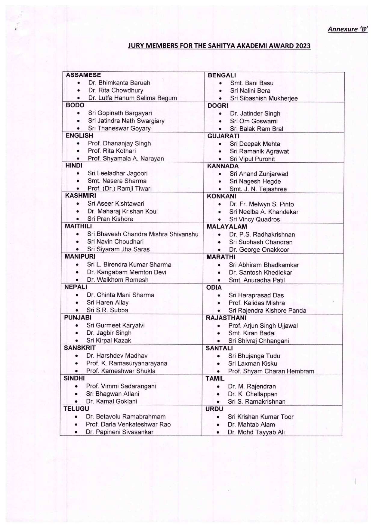 24 भारतीय भाषांमधील प्रतिष्ठित परीक्षक सदस्यांनी शिफारस केलेल्या पुरस्कारांना साहित्य अकादमीच्या कार्यकारी मंडळाने 20 डिसेंबर 2023 रोजी साहित्य अकादमीचे अध्यक्ष माधव कौशिक यांच्या अध्यक्षतेखाली झालेल्या बैठकीत मंजुरी दिली.