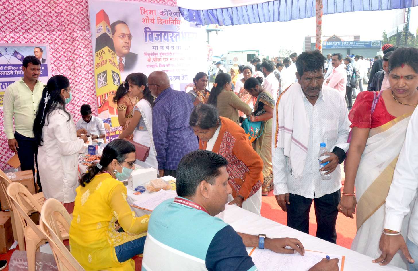 पुणे: कोरेगाव भीमा येथे २०७ व्या शौर्य दिनानिमित्त विजयस्तंभास अभिवादन करण्यासाठी आलेल्या लाखो भीमसैनिकांना आरोग्यसेवा पुरविण्यात आली. सिम्बायोसिस अभिमत विद्यापीठ व ‘सौ. शीला राज साळवे मेमोरिअल ट्रस्ट’ यांच्यातर्फे कोरेगाव भीमा येथे ‘भीमरुग्ण सेवा’ आरोग्य शिबिराचे आयोजन केले होते.या आरोग्य शिबिराचे उद्घाटन पुण्याचे नगर अभियंता प्रशांत वाघमारे यांच्या हस्ते झाले. प्रसंगी पाणी पुरवठा विभागाचे अभियंता सुरेश साखरे, सुशील मोहिते, ऍड. अतुल राज साळवे आदी मान्यवर उपस्थित होते. आरोग्य तपासणी, गोळ्या-औषधांचे वाटप, वेदनाशामक औषधे वाटप करण्यात आली.
