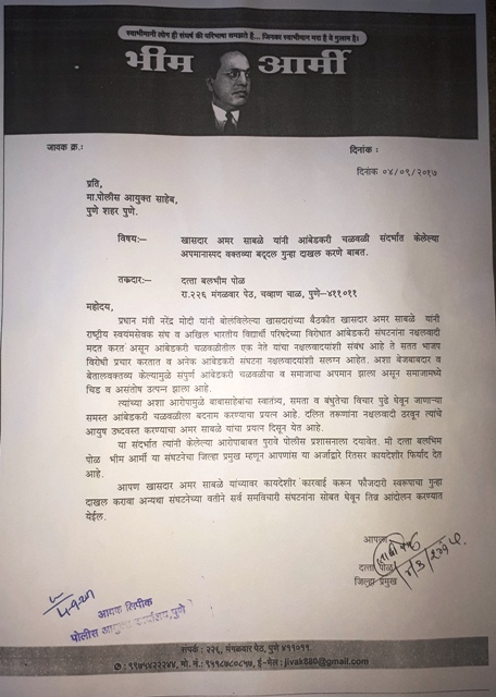 बाबासाहेबांची चळवळ बदनाम करून दलित तरुणांना नक्षलवादी ठरवून त्यांचे आयुष्य उध्वस्त करण्याची भाजप , राष्ट्रीय स्वयंसेवक संघ या सारख्या संघटनाची नियोजनबध्द योजना आहे . त्याचाच एक भाग म्हणून अमर साबळे यांच्या सारखा प्रामाणिक स्वयंसेवक अशा प्रकारची विधाने करीत आहे . त्यामुळे त्यांच्यावर तत्काळ गुन्हा दाखल करावा यासाठी पुणे शहर पोलिस आयुक्तांना भीम आर्मीच्या पुणे शहर जिल्हा शाखेच्यावतीने लेखी तक्रार देण्यात आली .