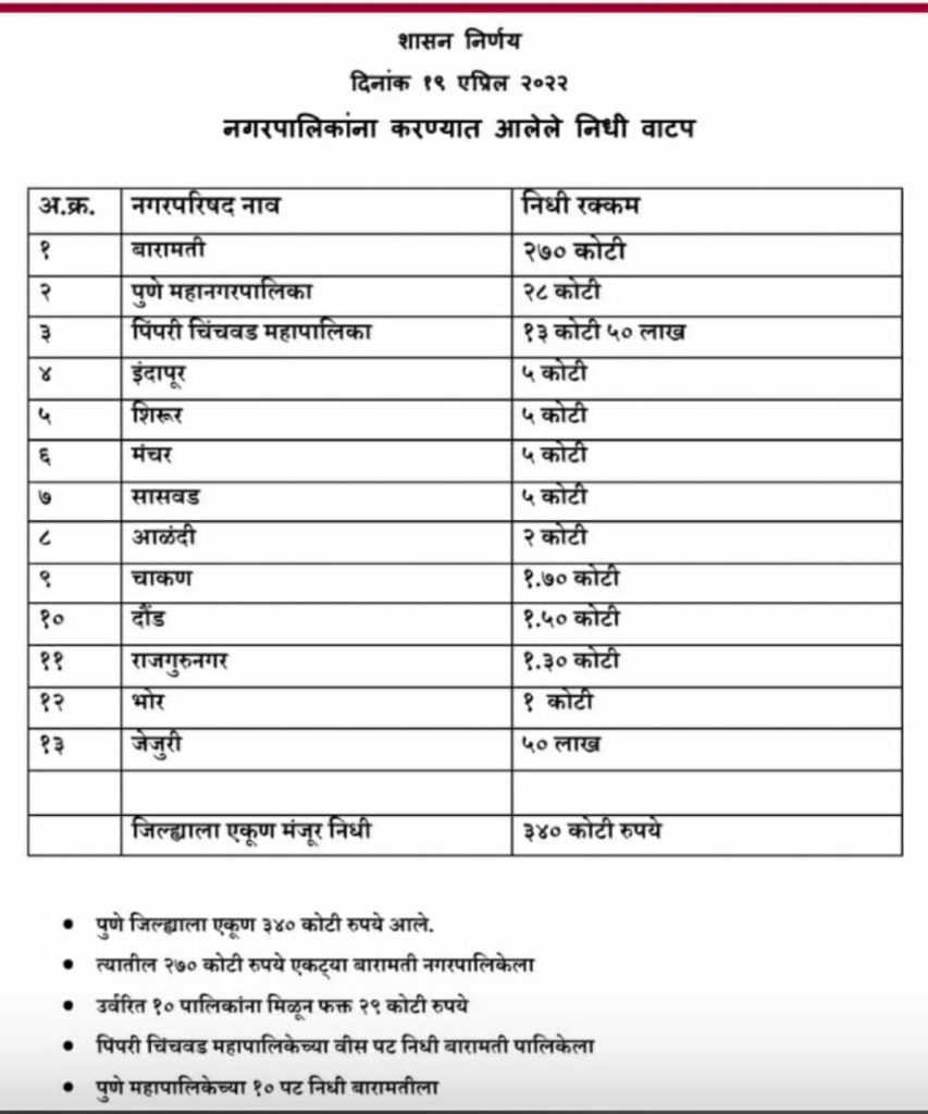बारामतीला २७० कोटी देणाऱ्या राष्ट्रवादीने पुणे महापालिकेला दिला अवघ्या २८ कोटीचा तर पिंपरी महापालिकेला दिला अवघ्या साडेतेरा कोटीचा निधी …पुण्याचे २ आमदार विधानसभेत करतात तरी काय ?