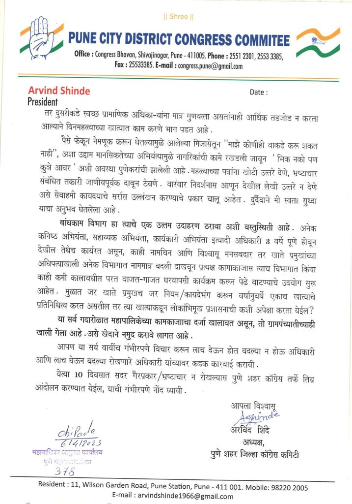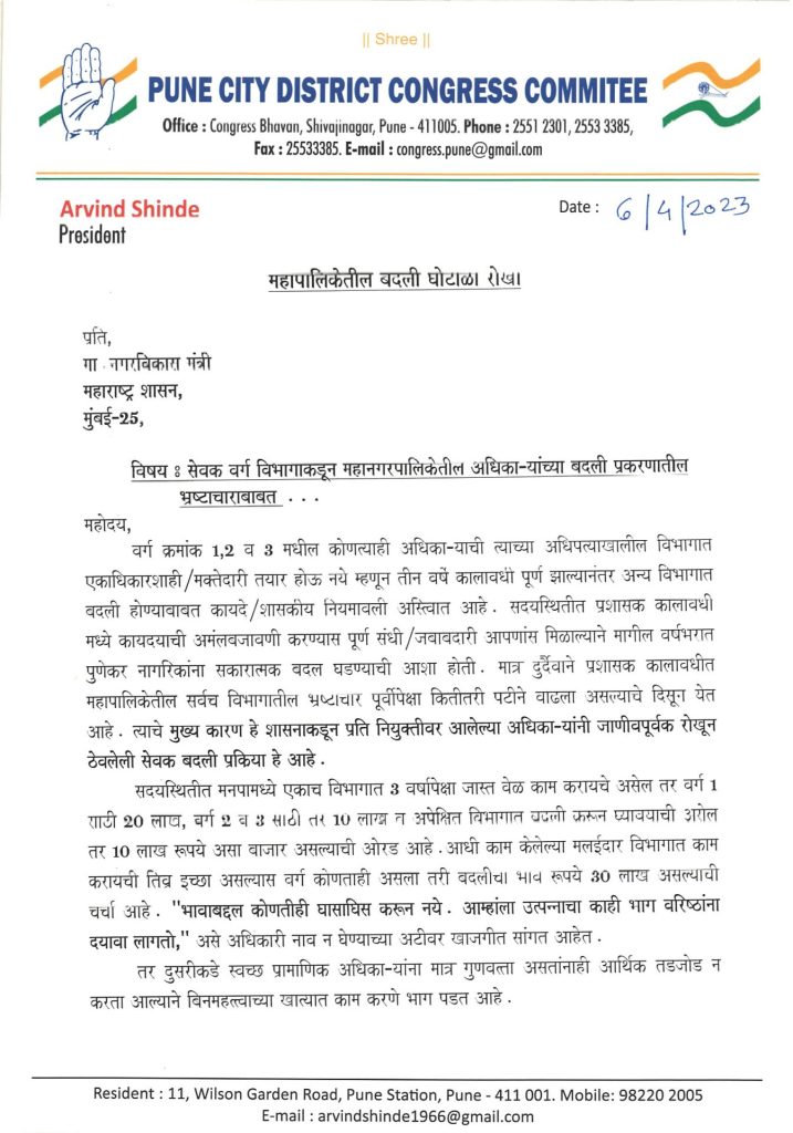 पुणे-महापालिकेत सध्या प्रशासकीय राजवट असून कधी निवडणुका होतील आणि लोकप्रतिनिधींच्या अंकुशाखालील कारभार सुरु होईल हे कोणाशी सांगणे कठीण झालेले आहे या काळात आता महापालिकेत प्रचंड भ्रष्टाचार वाढल्याच्या चर्चा सुरु झाल्या आहेत.महापालिकेतील वर्ग १ वर्ग २ आणि वर्ग ३ अशा तिन्ही स्तरावर बदल्यांसाठी लाखो रुपयांचा मलिदा चारला जातो आहे. मलईदार जागेवर बसण्यासाठी ३० लाखाचा भाव फुटला असून वर्ग १ साठी बदलीत २० लाख तर वर्ग २ आणि ३ साठी प्रत्येकी १०/ १० लाख मोजावे लागत असल्याची ओरड सुरु झाली आहे. यात प्रामाणिक अधिकारी कर्मचारी यांची मुस्कटदाबी होत असून पात्र अधिकारी सडत आहेत आणि अपात्र अधिकारी चंगळ करू लागले आहेत, यामुळे महापालिकेचा दर्जा प्रचंड घसरला आहे,हा भ्रष्ट कारभार त्वरित रोखा अन्यथा आम्हाला उग्र आंदोलन हाथी घ्यावे लागेल असा इशारा शहर कॉंग्रेसचे अध्यक्ष अरविंद शिंदे यांनी दिला आहे. त्यांनी याबाबत नगरविकास मंत्री यांना पत्र दिले आहे तसेच महापालिका आयुक्तांना देखील पत्र दिले आहे.