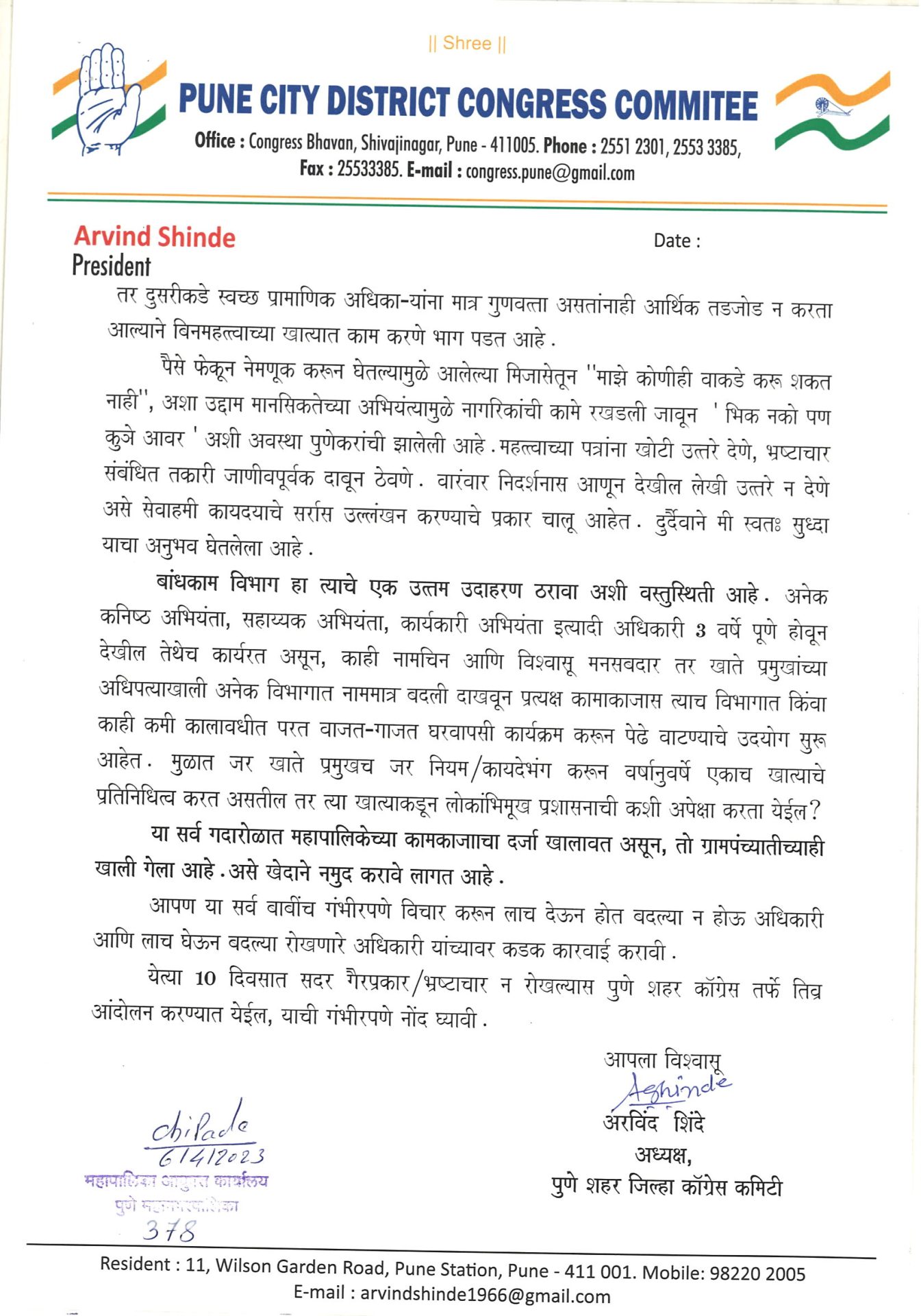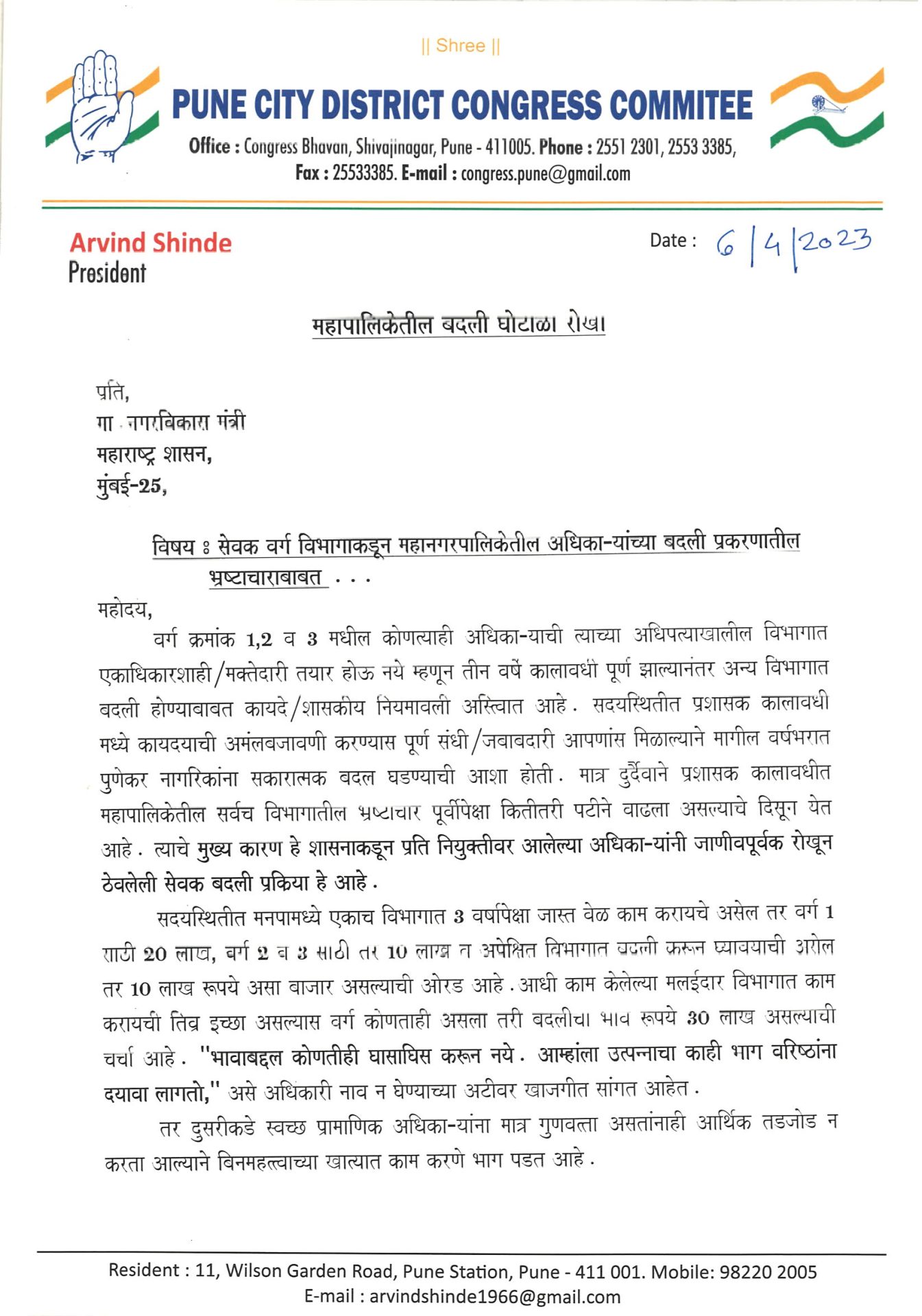 पुणे-महापालिकेत सध्या प्रशासकीय राजवट असून कधी निवडणुका होतील आणि लोकप्रतिनिधींच्या अंकुशाखालील कारभार सुरु होईल हे कोणाशी सांगणे कठीण झालेले आहे या काळात आता महापालिकेत प्रचंड भ्रष्टाचार वाढल्याच्या चर्चा सुरु झाल्या आहेत.महापालिकेतील वर्ग १ वर्ग २ आणि वर्ग ३ अशा तिन्ही स्तरावर बदल्यांसाठी लाखो रुपयांचा मलिदा चारला जातो आहे. मलईदार जागेवर बसण्यासाठी ३० लाखाचा भाव फुटला असून वर्ग १ साठी बदलीत २० लाख तर वर्ग २ आणि ३ साठी प्रत्येकी १०/ १० लाख मोजावे लागत असल्याची ओरड सुरु झाली आहे. यात प्रामाणिक अधिकारी कर्मचारी यांची मुस्कटदाबी होत असून पात्र अधिकारी सडत आहेत आणि अपात्र अधिकारी चंगळ करू लागले आहेत, यामुळे महापालिकेचा दर्जा प्रचंड घसरला आहे,हा भ्रष्ट कारभार त्वरित रोखा अन्यथा आम्हाला उग्र आंदोलन हाथी घ्यावे लागेल असा इशारा शहर कॉंग्रेसचे अध्यक्ष अरविंद शिंदे यांनी दिला आहे. त्यांनी याबाबत नगरविकास मंत्री यांना पत्र दिले आहे तसेच महापालिका आयुक्तांना देखील पत्र दिले आहे.