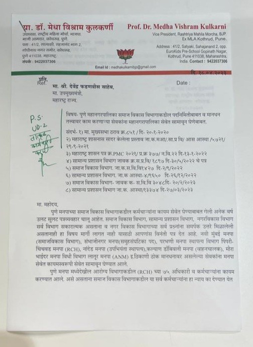 पुणे मनपा मध्येदेखील आरोग्य विभागाकडील (RCH) च्या 75 अधिकारी व कर्मचाऱ्यांना कायम करण्यात आले. असे असताना समाज विकास विभागाकडील या सर्व कर्मचाऱ्यांना हा न्याय का देण्यात येत नाही याचे आश्चर्य वाटते. मनपा वरील आर्थिक बोजा या निर्णयाने फारसा वाढणार नसल्याचेही आकडेवारीवरुन स्पष्ट होत आहे.या सर्वाचा सकारात्मकरित्या विचार करुन समाज विकास विभागाकडील मानधन तत्त्वावरील सर्व कर्मचाऱ्यांना कायम सेवेत घेऊन न्याय द्यावा अशी विनंती या पत्राद्वारे उपमुख्यमंत्री देवेंद्र फडणवीस यांना केली आहे. त्यावर त्यांनी त्वरित कार्यवाही करावी असा आदेश UD 2 विभागाला दिला आहे.