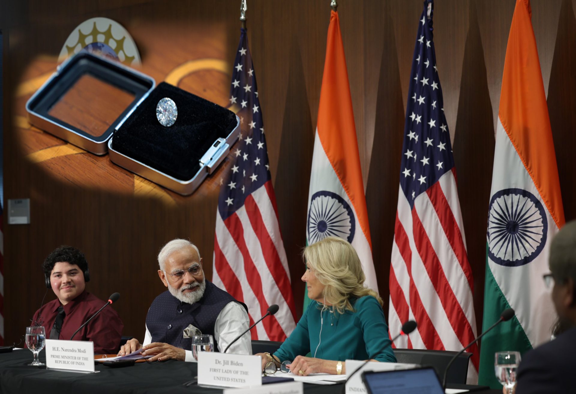 पंतप्रधान मोदींनी अमेरिकेच्या फर्स्ट लेडी जिल बायडेन यांना लॅबमध्ये बनवलेला 7.5 कॅरेटचा पर्यावरणपूरक ग्रीन डायमंड भेट दिला. त्याचवेळी, ‘उपनिषदाची 10 तत्त्वे’ या पुस्तकाच्या पहिल्या आवृत्तीसोबतच राष्ट्रपती बायडेन यांना जयपूरच्या कारागिरांनी बनवलेली म्हैसूर चंदनाची खास पेटी भेट देण्यात आली. या पेटीच्या आत गणपतीची मूर्ती आणि दिवा सोबत 10 दान आहेत.