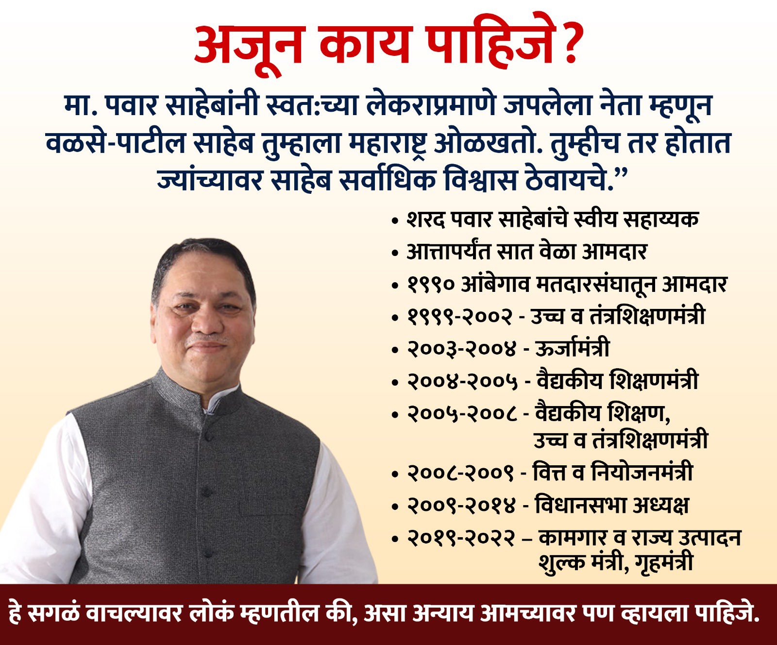 माझी आणि रोहित पवारांची एकदा भेट झाली. तुमच्या मतदारसंघाचा प्रश्न असेल तर मी माझ्या आमदारकीचा राजीनामा देतो आणि तुम्ही आंबेगाव विधानसभेतून उभे रहा. त्यामुळे या व्यतिरिक्त माझं कोणतेही भांडण नाही. मी साहेबांच्या कुटुंबाविरोधात कधीच जाऊ शकत नाही, असे स्पष्ट मत अजित पवार गटाचे नेते दिलीप वळसे पाटील यांनी व्यक्त केले आहे. मंचर येथे कार्यकर्ता मेळाव्याचे आयोजन करण्यात आले होते. त्यावेळी त्यांनी भाषणात दरम्यान हे वक्तव्य केले आहे. डिंभे धरणाच्या पाण्यावरून निर्माण झालेल्या वादामुळे आपण हा निर्णय घेतल्याचं वळसे पाटील यांनी सांगितलं.ईडीमुळे मी साहेबांची साथ सोडली नाही. मी जाहीर करतो. मला ईडी, सीबीआय किंवा इन्कम टॅक्सची नोटीस आलेली नाही. कुठलंही वैयक्तिक हित यामागे नाही. एका विद्वानाने सांगितलं की पराग आणि गोवर्धन डेअरीला नोटीस आली म्हणून हा निर्णय घेतला. माझा आणि या डेअरीचा काडीचाही संबंध नाही. आमच्या कुटुंबातील एकाही व्यक्तीचा या डेअरी सोबत एक रुपयाचाही संबंध नाही. १९८८ मध्ये देवेंद्र शहा यांची आणि माझी ओळख झाली. रामकृष्ण मोरे आले तेव्हा मैत्री झाली. शरद बँकेच्या प्रमोटरमध्ये देवेंद्र शाह यांचे वडील होते, असे वळले पाटील म्हणाले.एकनाथ शिंदे जेव्हा सगळे आमदार घेऊन गेले, तेव्हा दिलीप वळसे यांनी गृहमंत्री म्हणून मदत केली, असा आरोप करण्यात आला. आता साधा प्रश्न आहे. एकनाथ शिंदे गेल्यावर माझंही पद जाणार आहे, मी ही सत्तेबाहेर असणार. उलट उद्धव ठाकरेंना सहा महिन्यांपासून आम्ही सांगत होतो, तुमचे आमदार फुटणार आहेत. उद्धव ठाकरे, शरद पवार यांना कळवलं होतं. मग मी मदत करण्याचा प्रश्न येतो कुठं? असे म्हणत वळसे पाटील यांनी आरोप फेटाळून लावला. शरद पवार यांचे समर्थक आमदार जितेंद्र आव्हाड यांनी हा आरोप केला होता.आज आपण वेगळ्या पार्श्वभूमीवर या बैठकीचे आयोजन केलेलं आहे. नुकत्याच काही राजकीय घडामोडी घडल्या, त्यामाध्यमातून राज्यात नवीन समीकरण जुळून आलीत. अजितदादांच्या सोबतीने मी ही मंत्रिमंडळमध्ये सहभागी झालो. आपण हा निर्णय घेतला असला तरी आपण कोणी ही भाजपमध्ये प्रवेश केलेला नाही. आपली राष्ट्रवादी स्वतंत्र राहणार आहे. त्याद्वारेच आपण आपलं काम करणार आहोत, असं वळसे पाटील यांनी सांगितलं.माझ्यासमोर मोठा पेच होता. मधल्या काळात एक घटना घडली. पाठ बंधारे विभागाकडे एक प्रस्ताव आला. डिंभे धरणाचे पाणी बोगदा करून पलीकडे न्यायचं. पाणी आपली वैयक्तिक मालमत्ता नाही. अहमदनगर जिल्ह्याचा मी पालकमंत्री होतो, तेंव्हा पाण्यावरून वाद होऊ दिला नाही. मग मी पवार साहेबांकडे गेलो, दोन तीन बैठकाही झाल्या. पण ७१२ मीटर बोगद्यावर घ्यायचं ठरलं. मात्र या सरकारने निर्णय घेतला की बोगदा एकदम धरणाच्य