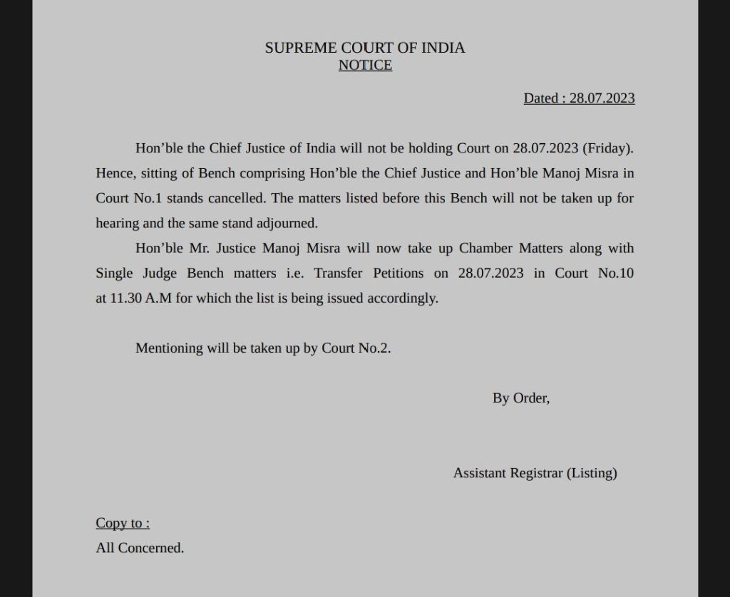 नवी दिल्ली-मणिपूर प्रकरणी सर्वोच्च न्यायालयात शुक्रवारी होणारी सुनावणी पुढे ढकलण्यात आली आहे. या प्रकरणाची सुनावणी सरन्यायाधीश डीवाय चंद्रचूड यांच्या खंडपीठासमोर होणार होती, मात्र प्रकृती अस्वास्थ्यामुळे ते आज न्यायालयात आले नाहीत. त्यामुळे न्यायमूर्ती चंद्रचूड आणि न्यायमूर्ती मनोज मिश्रा यांच्या खंडपीठासमोर प्रलंबित असलेल्या प्रकरणांची आज सुनावणी होणार नाही.मणिपूरमध्ये महिलांची नग्न परेड केल्याच्या प्रकरणाचा तपास सीबीआयकडे सोपवण्यात आल्याचे केंद्रीय गृह मंत्रालयाने गुरुवारी सर्वोच्च न्यायालयात प्रतिज्ञापत्र दाखल केले. या प्रकरणाची सुनावणी मणिपूरबाहेर हलवण्याची विनंती गृह मंत्रालयाने न्यायालयाला केली आहे.याप्रकरणी 7 जणांना अटक करण्यात आली आहे. ज्या मोबाईलवरून या घटनेचा व्हिडीओ बनवला होता तोही जप्त करण्यात आला आहे. पोलिसांनी मोबाईल सीबीआयकडे सुपूर्द केला आहे. व्हिडिओ शूट करणाऱ्या व्यक्तीलाही अटक करण्यात आली आहे.मणिपूर प्रकरणासंदर्भात 27 जुलै रोजी सर्वोच्च न्यायालयात आणखी एक याचिका दाखल करण्यात आली होती. यावर खंडपीठाने याचिकाकर्त्याला विचारले की, हा मुद्दा न्यायालयात आधीच पाहिला जात आहे, त्यामुळे आणखी एका याचिकेची काय गरज आहे. तसेच, त्यांनी आपली याचिका सरन्यायाधीश चंद्रचूड यांच्यासमोर मांडण्यास सांगितले.याचिका दाखल करणारे वकील विशाल तिवारी यांनी खंडपीठाला सांगितले की, मणिपूर हिंसाचाराशी संबंधित प्रलंबित याचिका 28 जुलै रोजी सुनावणीसाठी सूचीबद्ध आहेत. तिवारी यांनी विनंती केली की संबंधित प्रकरणासह त्यांची याचिका शुक्रवारी सुनावणीसाठी सूचीबद्ध केली जाईल.