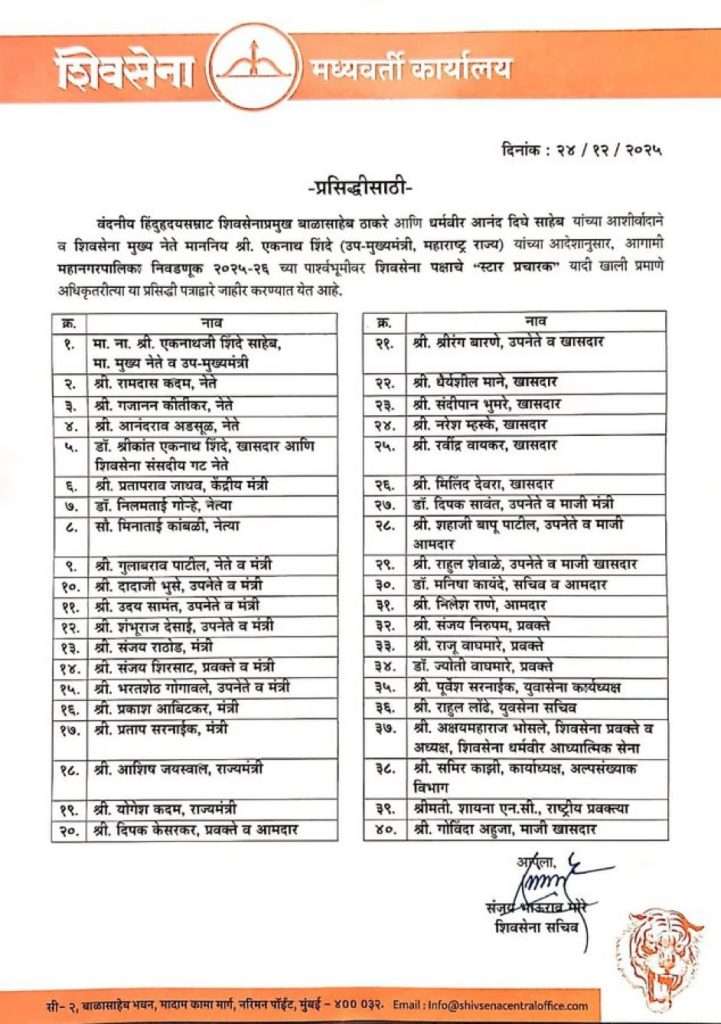 मुंबई | दि. २५ डिसेंबर २०२५ : आगामी महानगरपालिका निवडणूक २०२५-२६ च्या पार्श्वभूमीवर राज्याच्या राजकारणात निर्णायक भूमिका बजावणाऱ्या शिवसेनेने आपली निवडणूक रणनिती अधिक मजबूत करत पक्षाच्या ‘स्टार प्रचारकां’ची अधिकृत यादी जाहीर केली आहे.