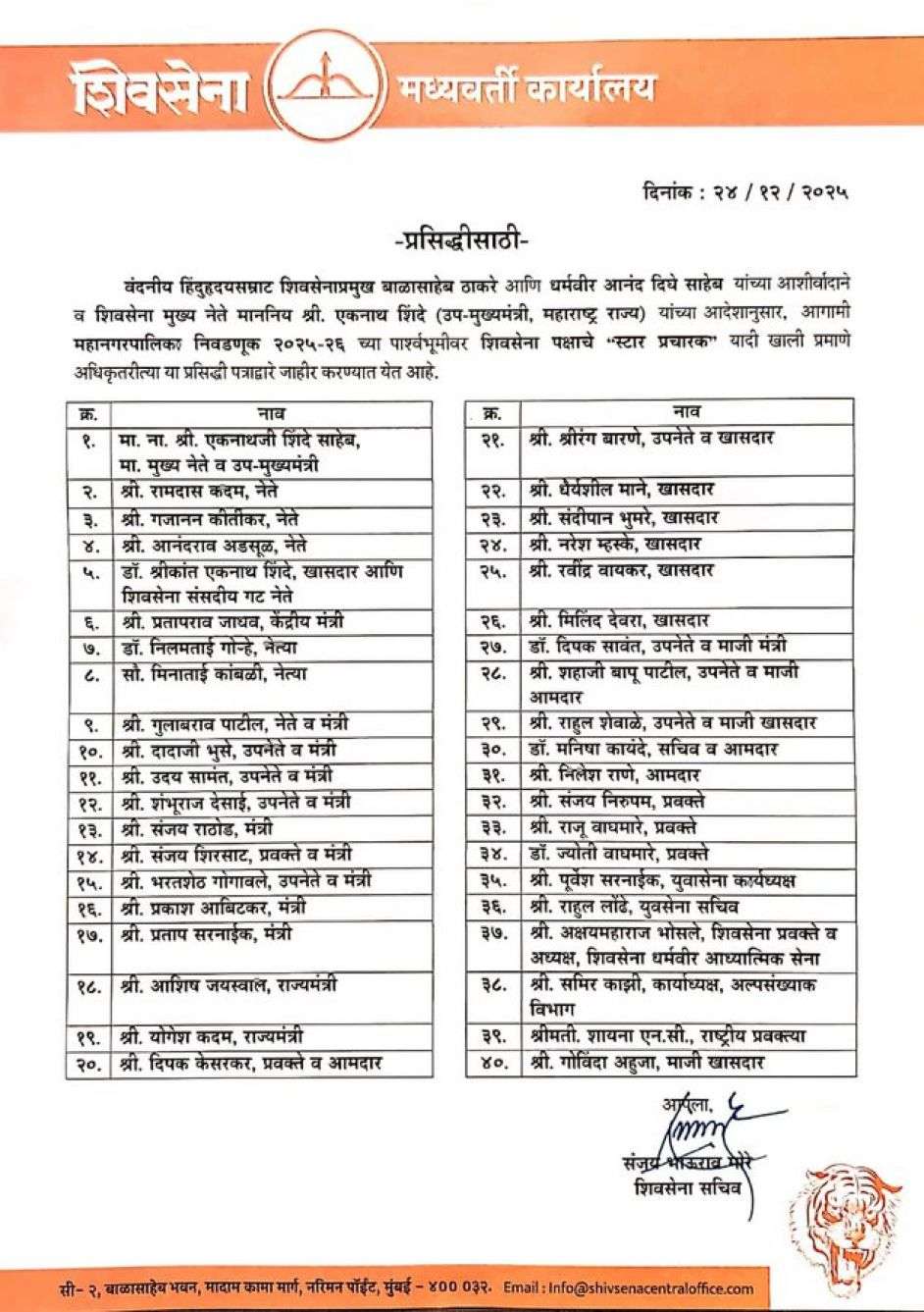 शिवसेना ही केवळ निवडणूक लढवणारा पक्ष नसून जनतेच्या प्रश्नांसाठी लढणारी, विकासाभिमुख आणि महाराष्ट्राच्या अस्मितेची वाहक शक्ती आहे, हा संदेश या प्रचारक यादीच्या माध्यमातून देण्यात आला आहे.