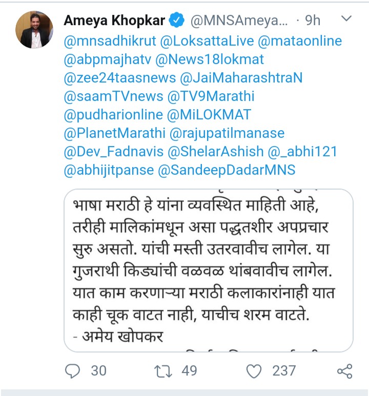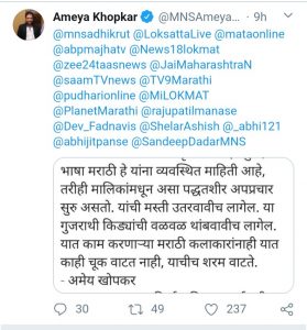 त्यांच्यासोबत महाराष्ट्र नवनिर्माण चित्रपट सेनेचे अध्यक्ष अमेय खोपर यांनीदेखील ट्विटरवरुन मालिकेविरोधात आक्रमक पवित्रा घेतला आहे. त्यांनी लिहीले की, हेच ते मराठीचे मारक मेहता आहेत. मनसेचा विरोध याच नीच वृत्तीला आहे. मुंबईची भाषा मराठी, हे यांना नीट माहिती आहे, तरीही मालिकेमधून असा प्रकारचा अप्रचार सुरू असतो. यांची मस्ती उतरवावीच लागेल. या गुजराथी किड्यांची वळवळ थांबवावीच लागेल. यात काम करणाऱ्या मराठी कलाकारांनाही यात काही चूक वाटत नाही, याचीच शरम वाटते.”