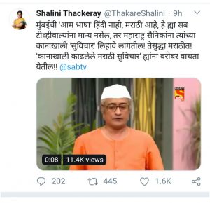 मनसे चित्रपट सेनेच्या कार्याध्यक्षा शालिनी ठाकरे यांनी ट्विटरवरुन मालिकेला आणि चॅनेलला चांगलाच दम दिला आहे. त्यांनी ट्विटरवर लिहीले की, “मुंबईची ‘आम भाषा’ हिंदी नाही, मराठी आहे, हे ह्या सब टीव्हीवाल्यांना मान्य नसेल, तर महाराष्ट्र सैनिकांना त्यांच्या कानाखाली ‘सुविचार’ लिहावे लागतील! तेसुद्धा मराठीत! कानाखाली काढलेले मराठी सुविचार’ ह्यांना बरोबर वाचता येतील!”