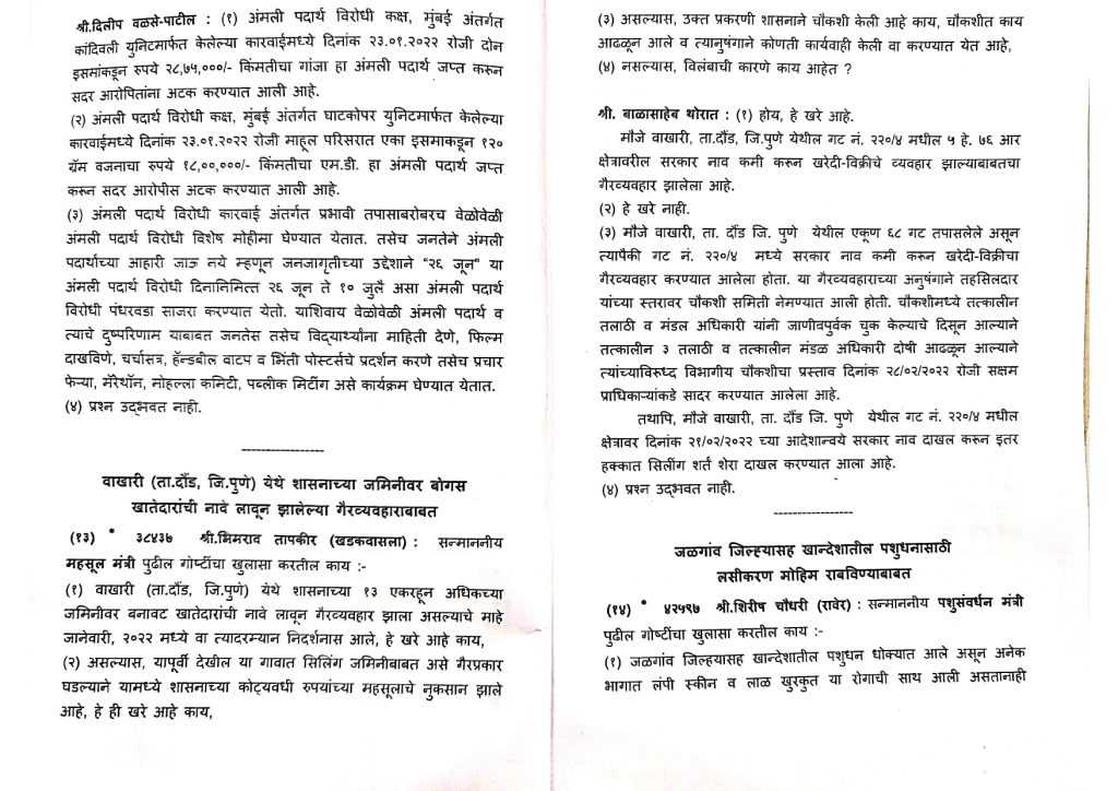 या प्रश्नात महसूलमंत्री बाळासाहेब थोरात यांनी सभागृहात दिलेल्या लेखी उत्तरामध्ये मौजे वाखारी, ता.दौंड, जि.पुणे येथील गट नं. 220/4 मधील 5 हे. 76 आर क्षेत्रावरील सरकार नाव कमी करून खरेदी-विक्रीचे व्यवहार झाल्याबाबतचा गैरव्यवहार झालेला आहे. हे मान्य करून मौजे वाखारी, ता. दौंड जि. पुणे येथील एकूण 68 गट तपासलेले असून त्यापैकी गट नं. 220/4 मध्ये सरकार नाव कमी करून खरेदी-विक्रीचा गैरव्यवहार करण्यात आलेला होता असे सांगितले या गैरव्यवहाराच्या अनुषंगाने तहसिलदार यांच्या स्तरावर चौकशी समिती नेमण्यात आली होती असे सांगून चौकशीमध्ये तत्कालीन तलाठी व मंडल अधिकारी यांनी जाणीवपुर्वक चुक केल्याचे दिसून आल्याने* तत्कालीन 3 तलाठी व तत्कालीन मंडळ अधिकारी दोषी आढळून आल्याने त्यांच्याविरूध्द विभागीय चौकशीचा प्रस्ताव दिनांक 28/02/2022 रोजी सक्षम प्राधिकाऱ्यांकडे सादर करण्यात आलेला आहे असे सांगितले. तसेच, मौजे वाखारी, ता. दौंड जि. पुणे येथील गट नं. 220/4 मधील क्षेत्रावर दिनांक 21/02/2022 च्या आदेशान्वये सरकार नाव दाखल करून इतर हक्कात सिलींग शर्तं शेरा दाखल करण्यात आला आहे असे सांगितले.